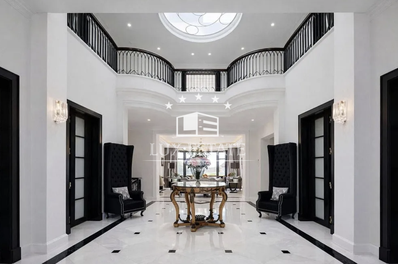 A grand entrance welcomes you through an impressive portico into a stunning double-height foyer. Marble floors with intricate detailing, soaring ceilings, and a graceful curved staircase beneath a skylight create a striking first impression, while a central gallery above enhances the sense of space and natural light throughout the home.