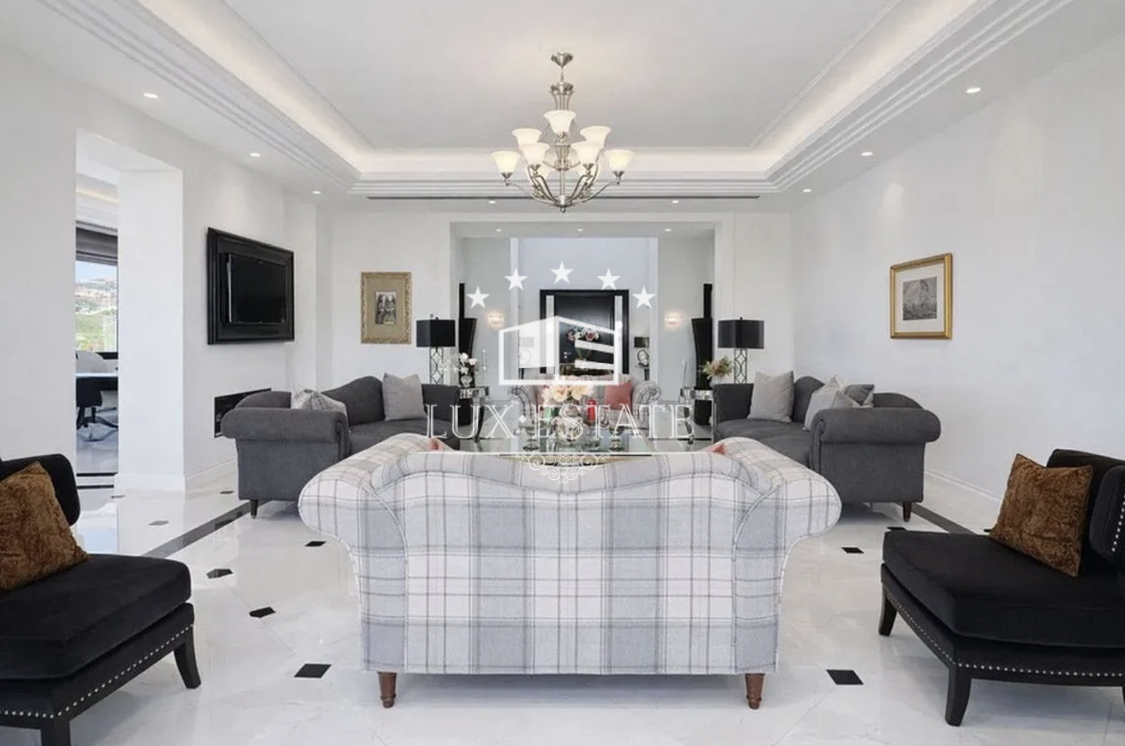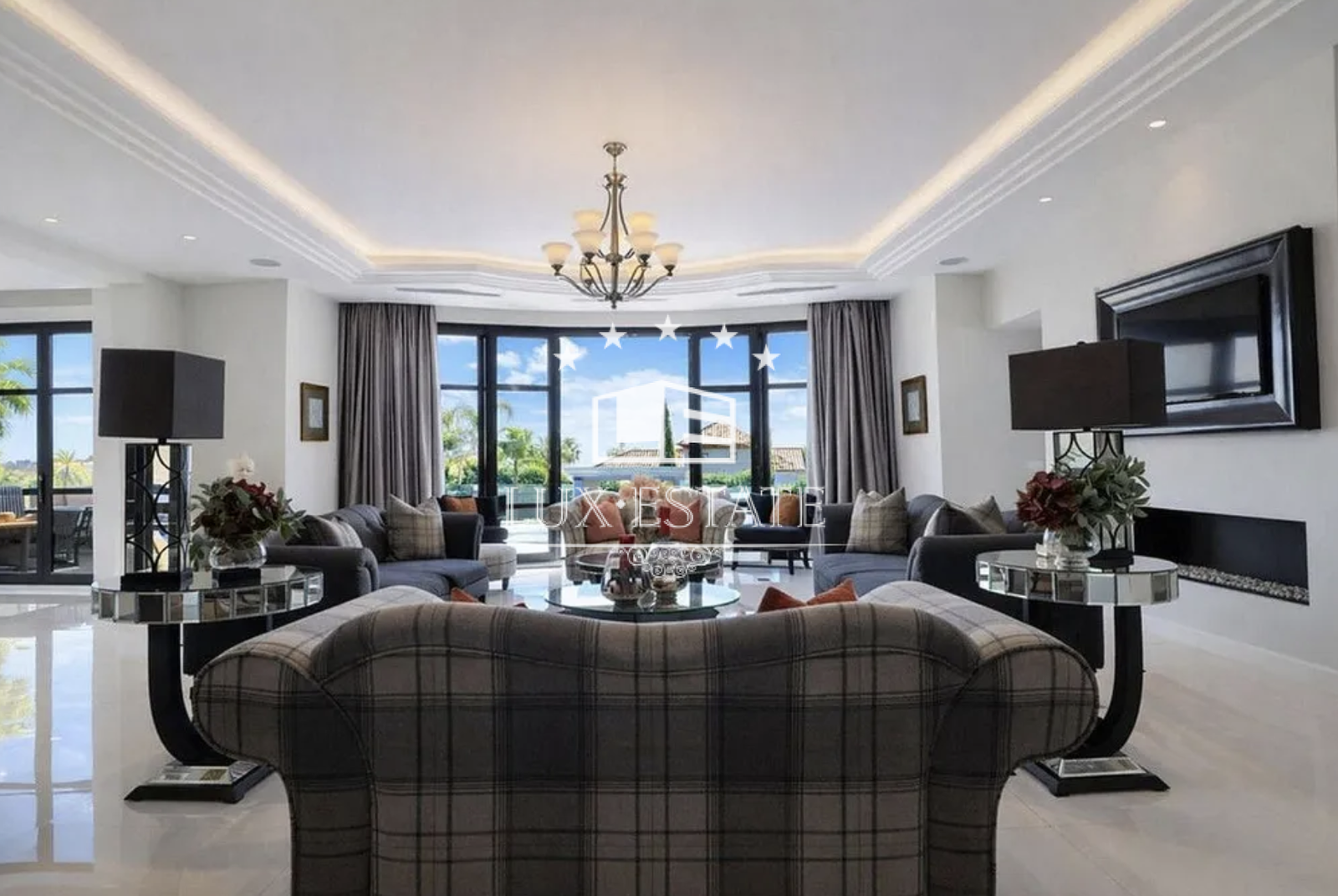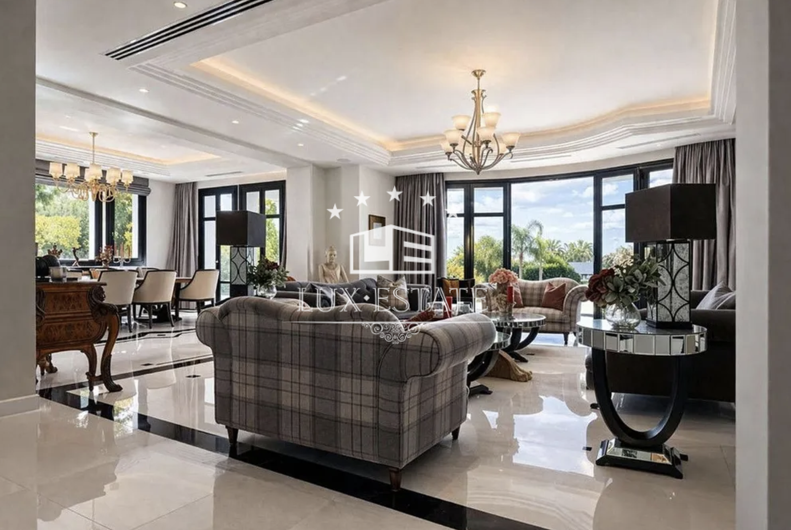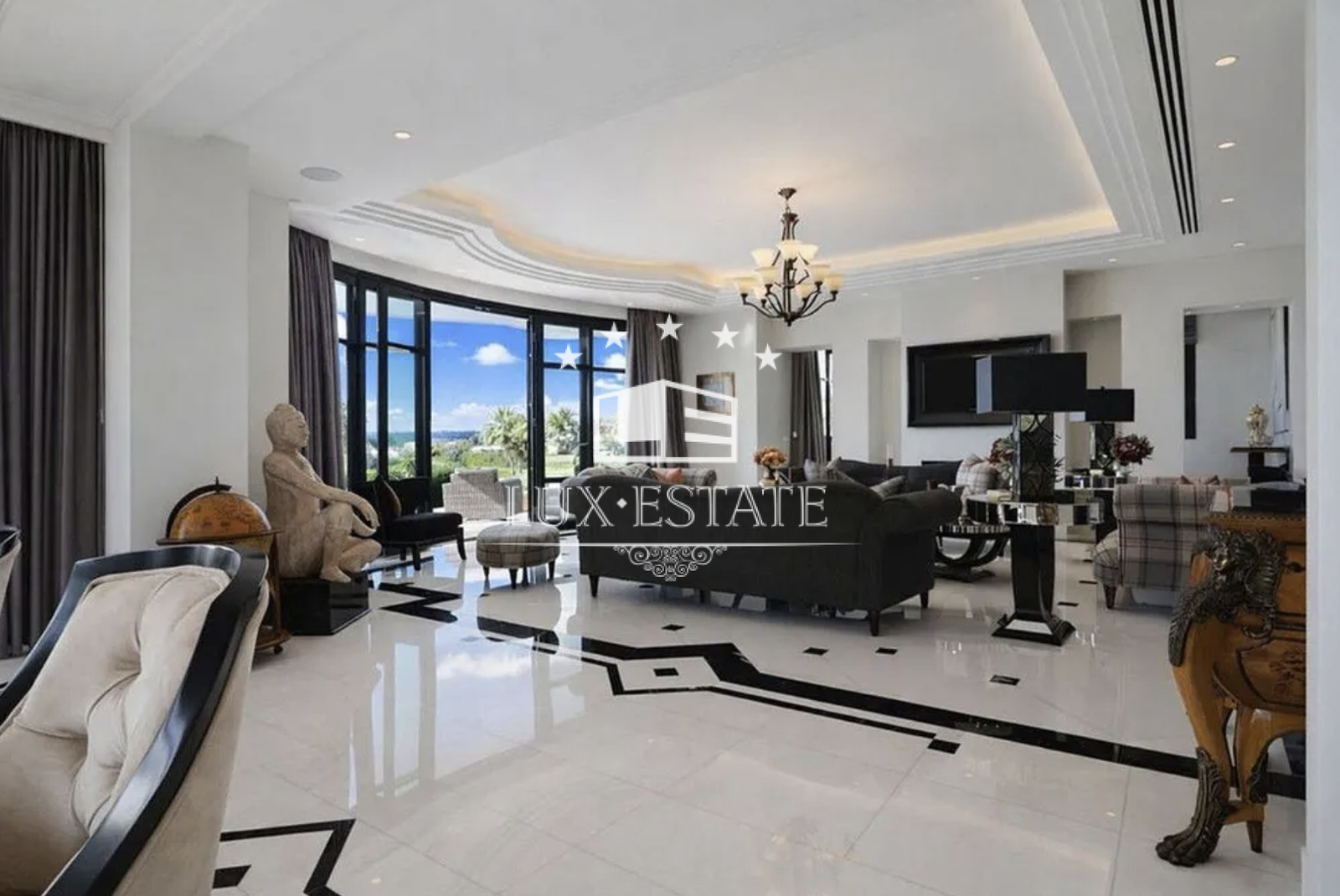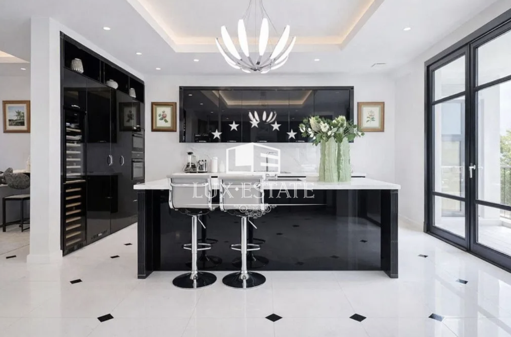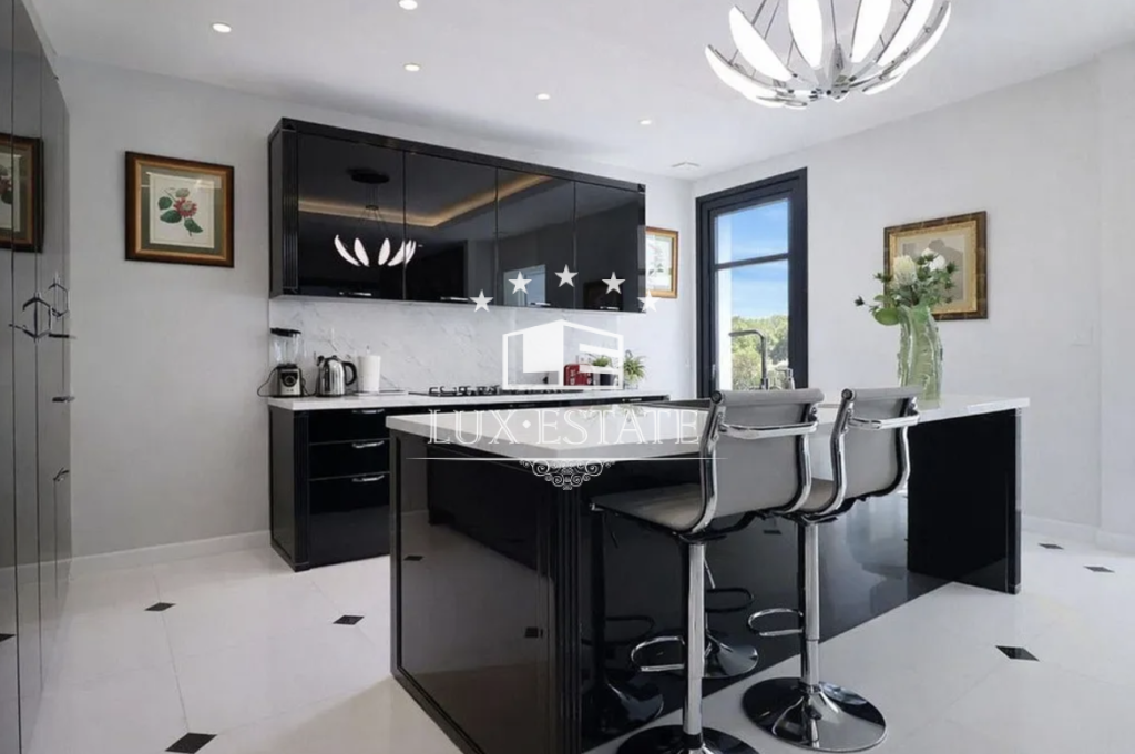 The main living and dining areas are beautifully arranged in a semi-circular layout, showcasing architectural harmony and refined finishes. Expansive glass doors open onto the main terrace, seamlessly connecting indoor and outdoor living while framing the spectacular views. A formal dining room, illuminated by a statement chandelier, provides an elegant setting for entertaining, while the adjacent kitchen offers a more relaxed and functional family space.