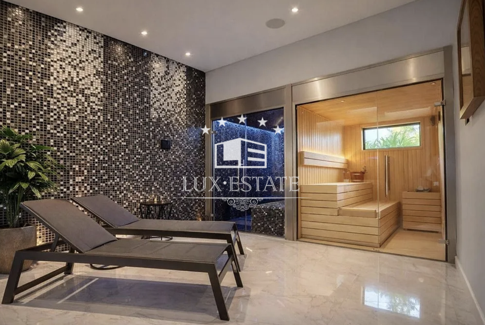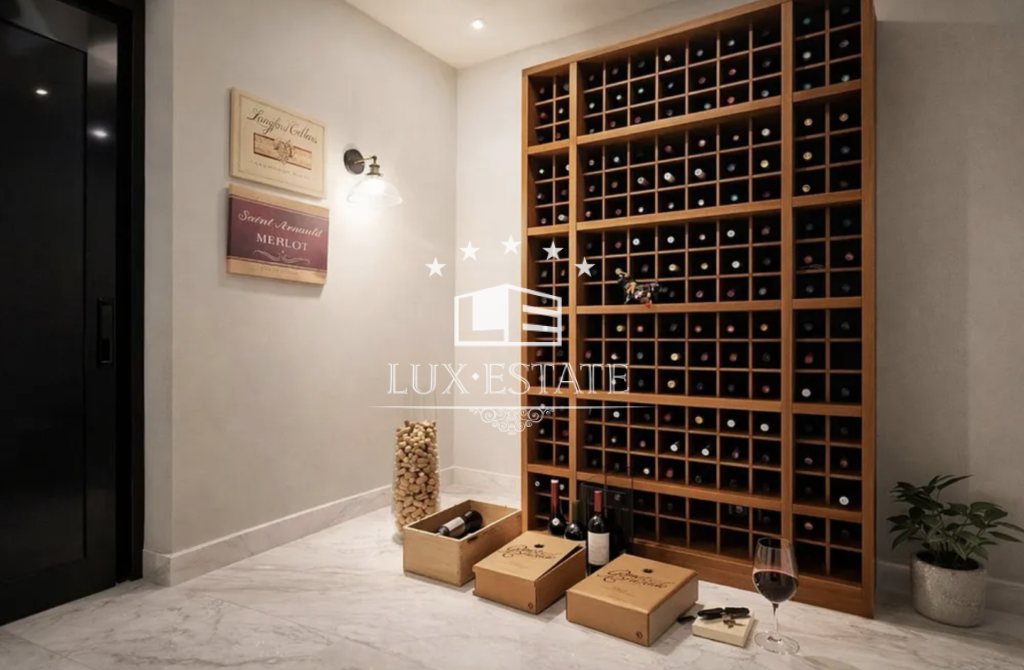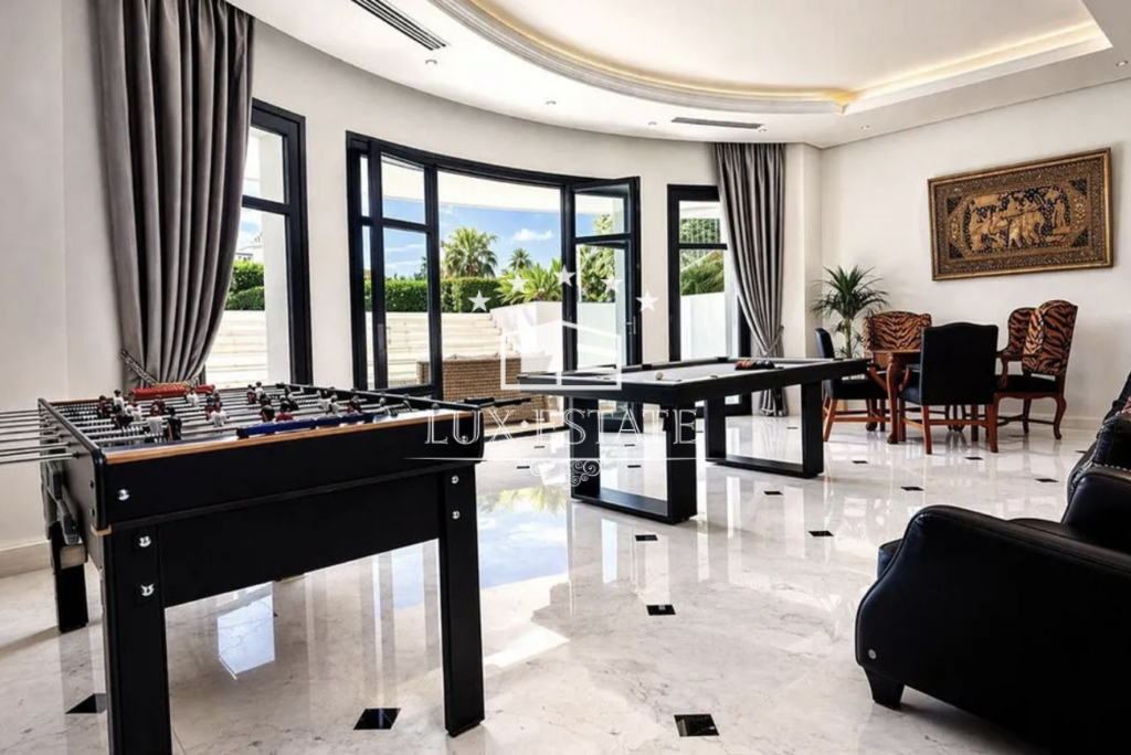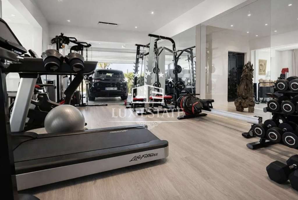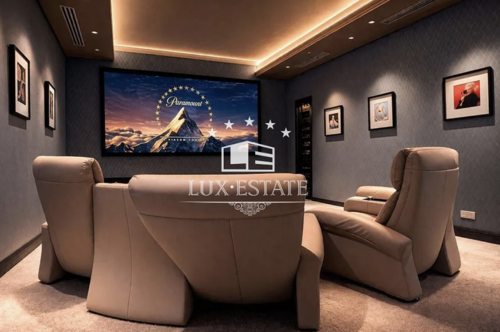 The lower level is dedicated to leisure and wellness, offering an exceptional range of amenities including a private cinema room with reclining seating, a fully equipped gym, a spa area with sauna and steam room, and a wine cellar. A spacious entertainment lounge opens directly onto the garden, creating the perfect setting for social gatherings or relaxed family moments.