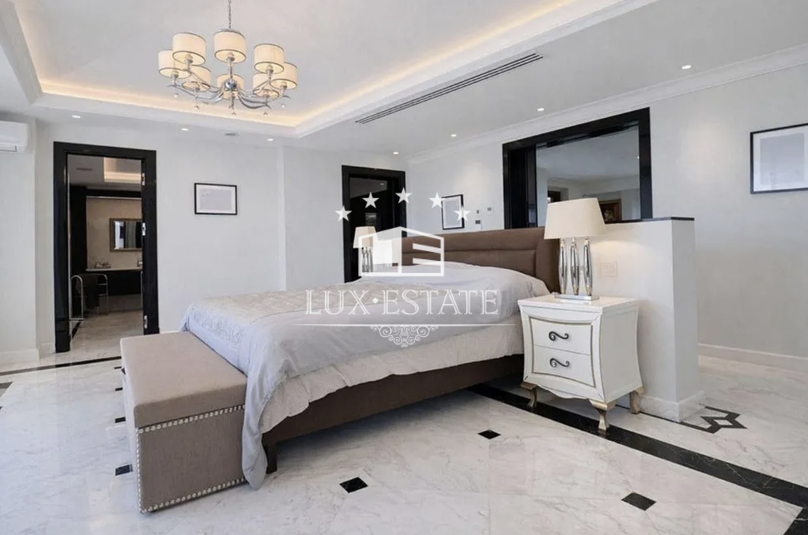 Upstairs, the impressive master suite serves as a luxurious private sanctuary, designed to maximise space, light, and breathtaking sea views. The bedroom opens onto a large private terrace overlooking the gardens and coastline. Soft neutral tones, high ceilings, and elegant finishes create a calm and sophisticated atmosphere. The suite also includes a spacious walk-in wardrobe with bespoke cabinetry and a central dressing area, as well as a luxurious bathroom featuring a freestanding bathtub perfectly positioned to enjoy the views.