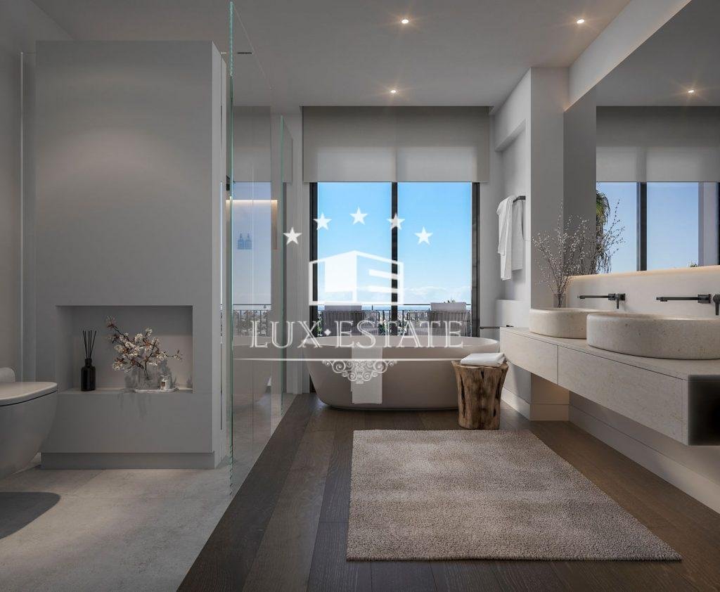 Upstairs, you’ll discover a sizable master bedroom with a walk-in closet, a spacious en-suite bathroom, and a large terrace overlooking the Mediterranean. Additionally, there’s a second bedroom with an en-suite bathroom on this level.