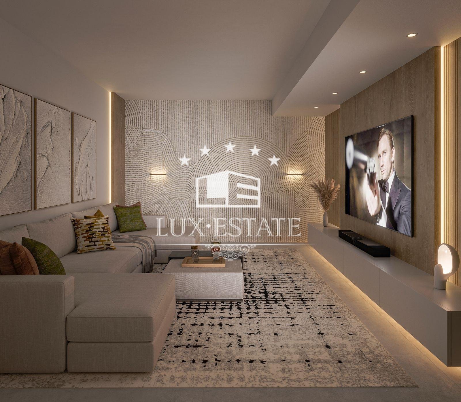The lower level, with its broad windows, boasts a bedroom with en-suite facilities, a laundry room, a private cinema, ample storage space, and exclusive parking.