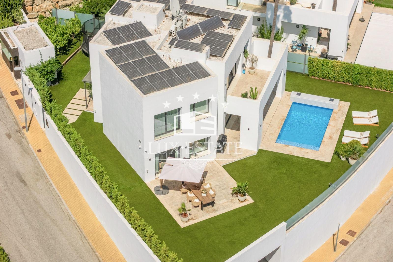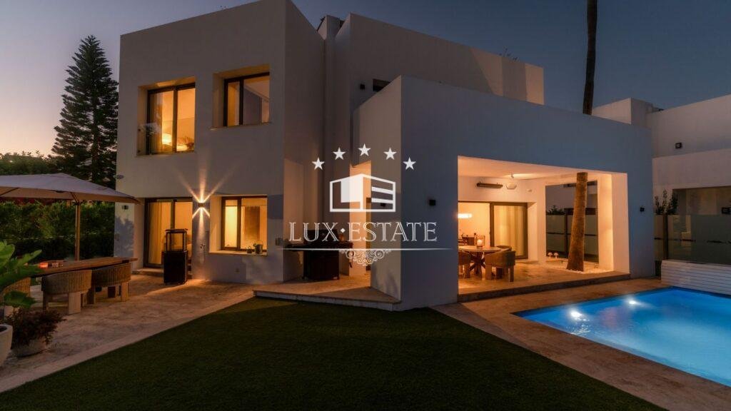 Designed for outdoor living, the villa includes a private swimming pool, landscaped gardens, and multiple terraces, both covered and open — perfect for entertaining or relaxing throughout the year.