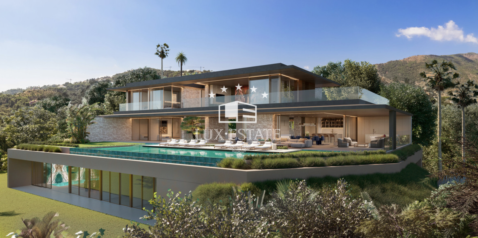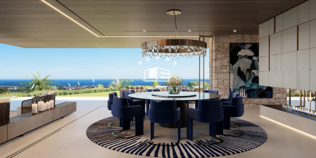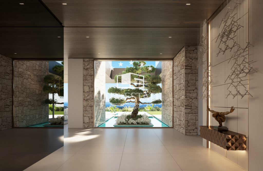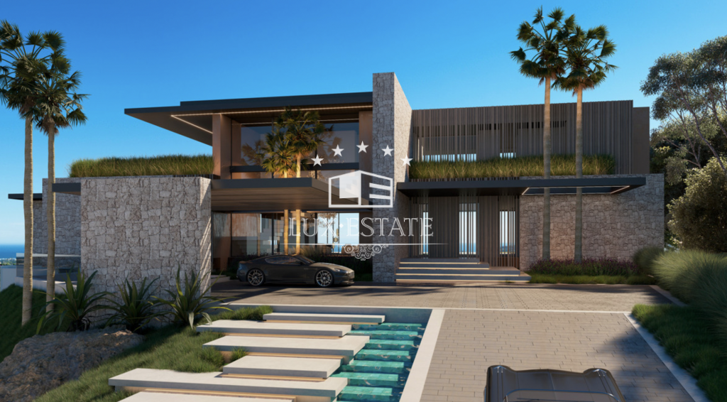 Beautiful, modern house located on the top of Herrojo Alto, with panoramic views. Driving up the scenic and green roads of the gated community Herrojo Alto you will arrive to the entrance of this spectacular villa surrounded by natural elements. The entrance to the house offers plenty of light and breathtaking views through its large floor to ceiling windows. Stepping into the living area there is a lounge with a fireplace that beautifully divides the lounge from a large dining room and kitchen. The kitchen is adjoined by an outdoor kitchen creating a spectacular cooking experience. On this floor there are two guest bedrooms en-suite. Walking up the stairs to the first floor we find three bedrooms en-suite, including a spacious 70 m2 master bedroom with a walk-in closet, bathroom and a private terrace with a jacuzzi. On the lower level we encounter a luxurious 800 m2 area with several lounges for entertainment or relaxing, a playroom, cinema room and a gym, an indoor spa with pool and a jacuzzi. Furthermore there ́s a home office, garage for 8 cars and 3 bedrooms en-suite, one of them with its own entrance and kitchenette making it suitable for staff.