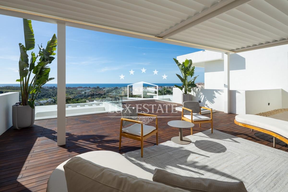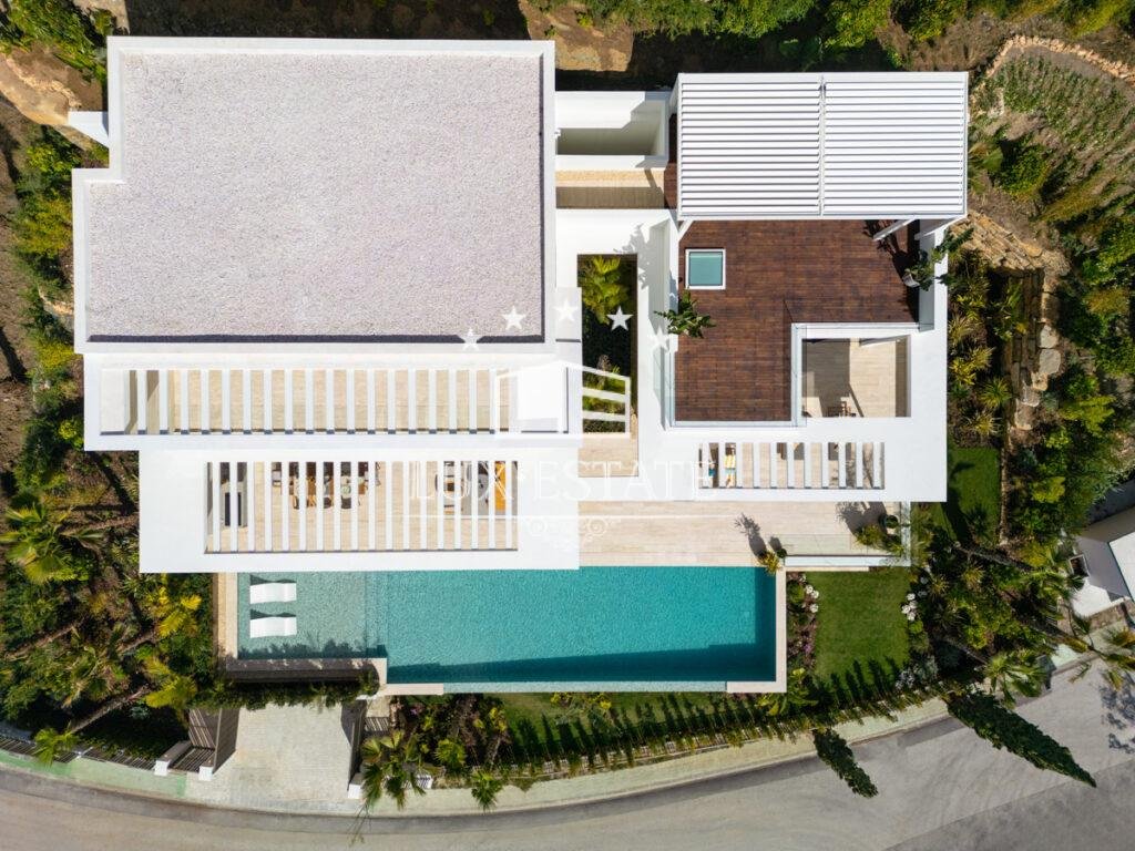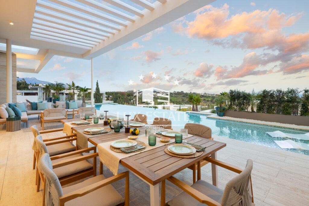 The villa’s cutting-edge architectural design is defined by clean lines, bold geometric forms, and expansive terraces that frame the scenery like artwork. Covered and uncovered lounge areas allow for effortless year-round enjoyment—ideal for al fresco dining, entertaining, or simply relaxing under the Andalusian sun.