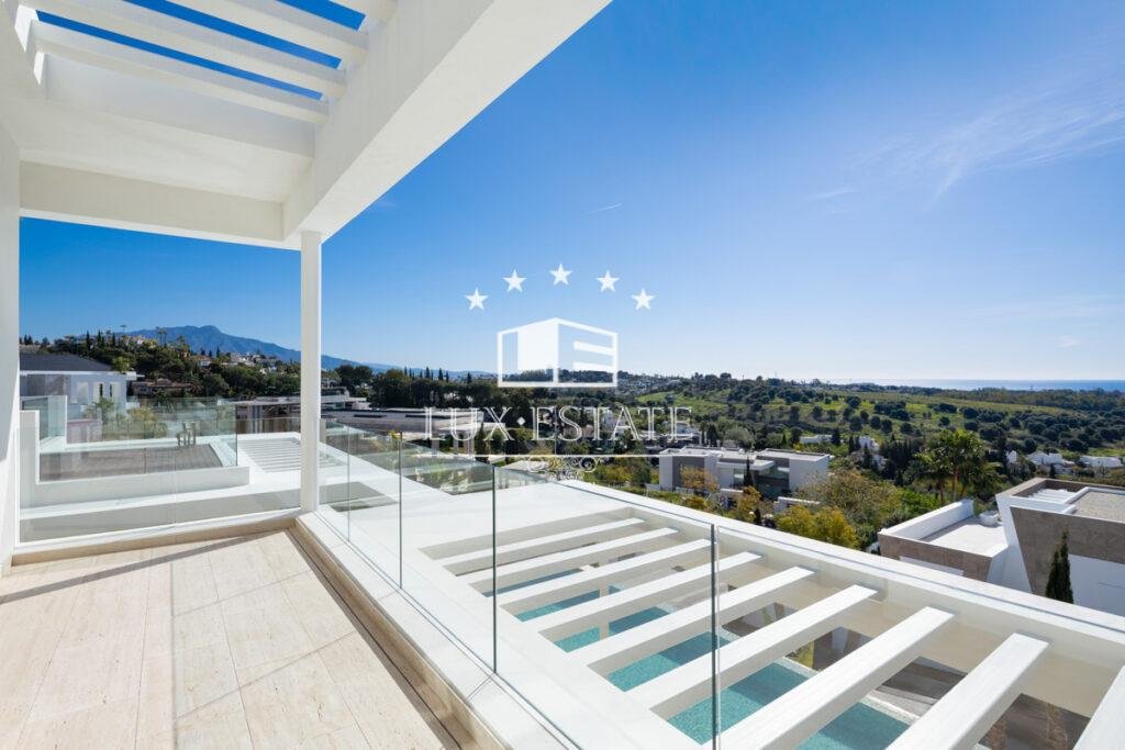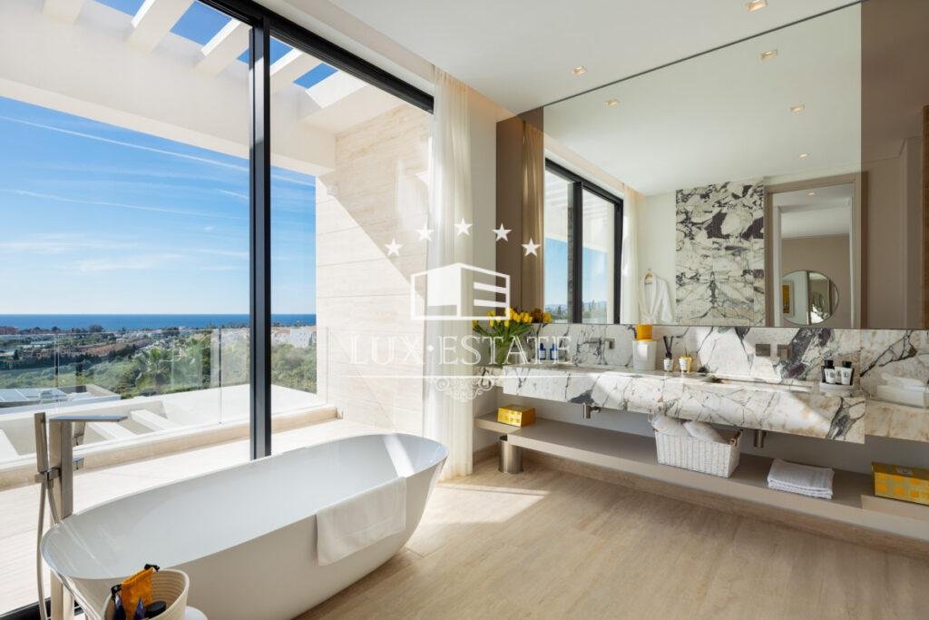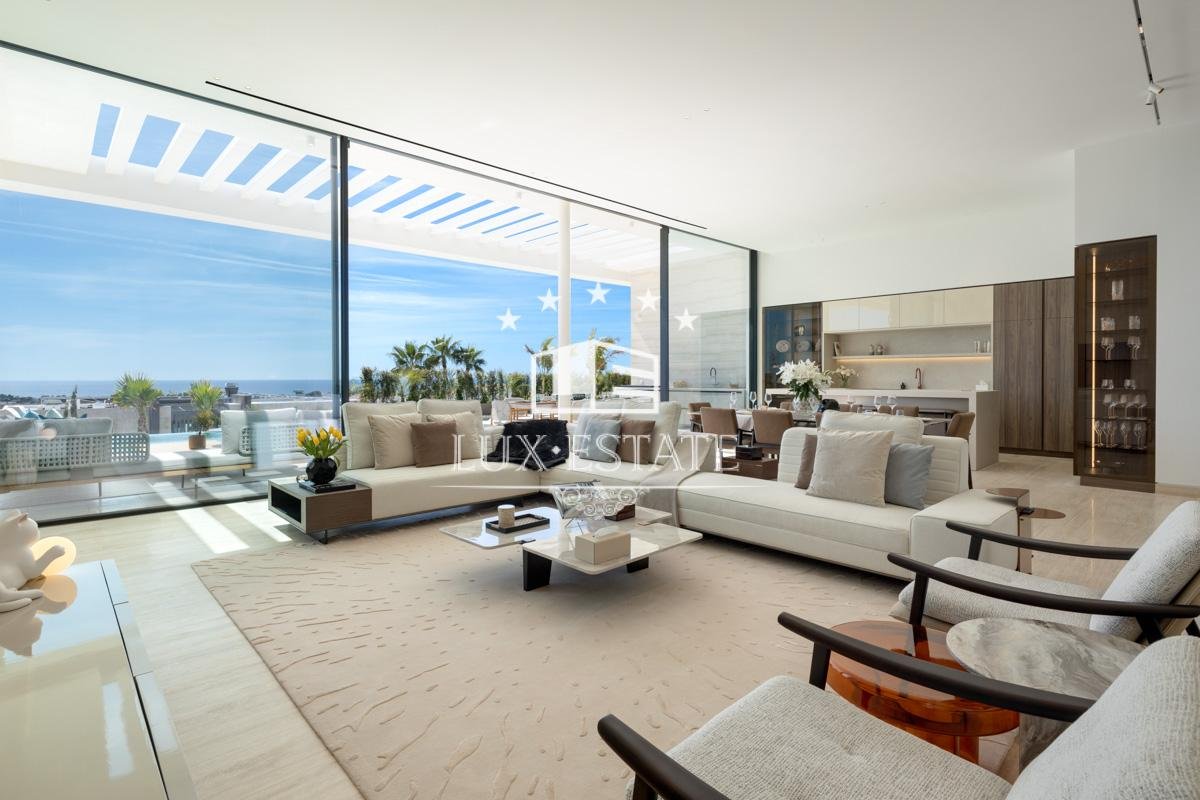 Set on a commanding elevated plot, the villa boasts sweeping panoramic views that stretch across the Mediterranean Sea, lush golf courses, and the surrounding mountain landscape. Every angle of the home is designed to maximize these stunning vistas while maintaining total seclusion and tranquility.