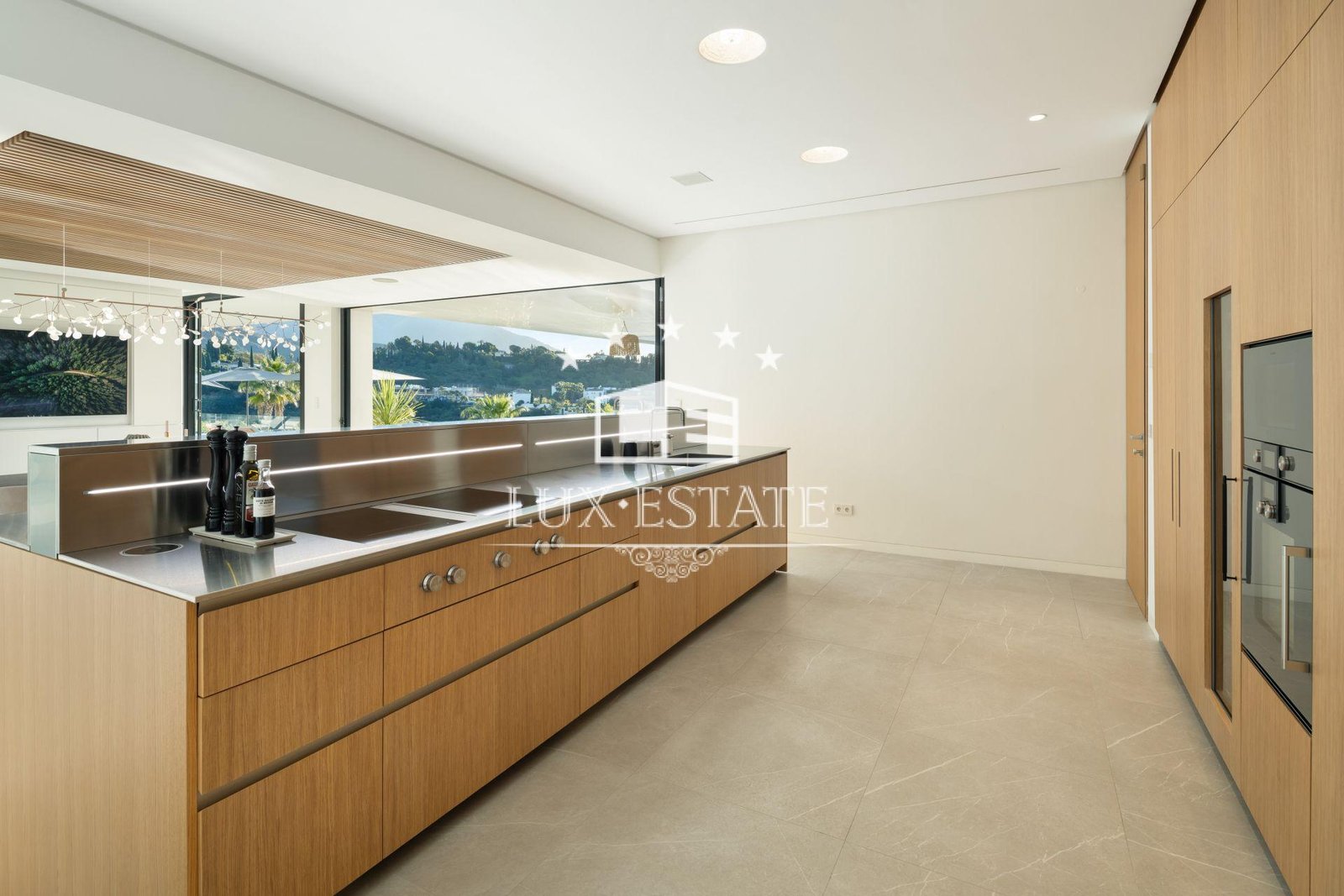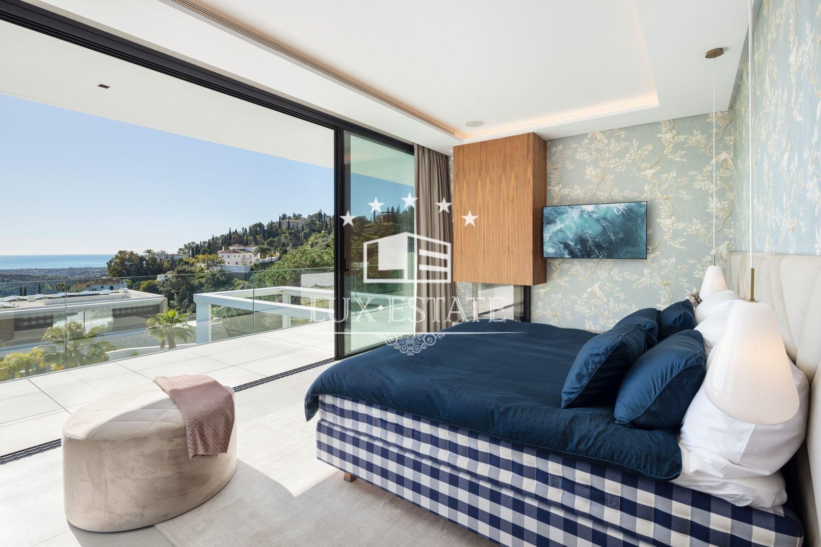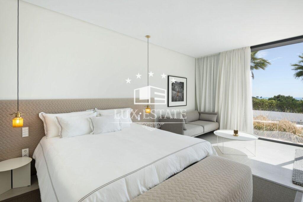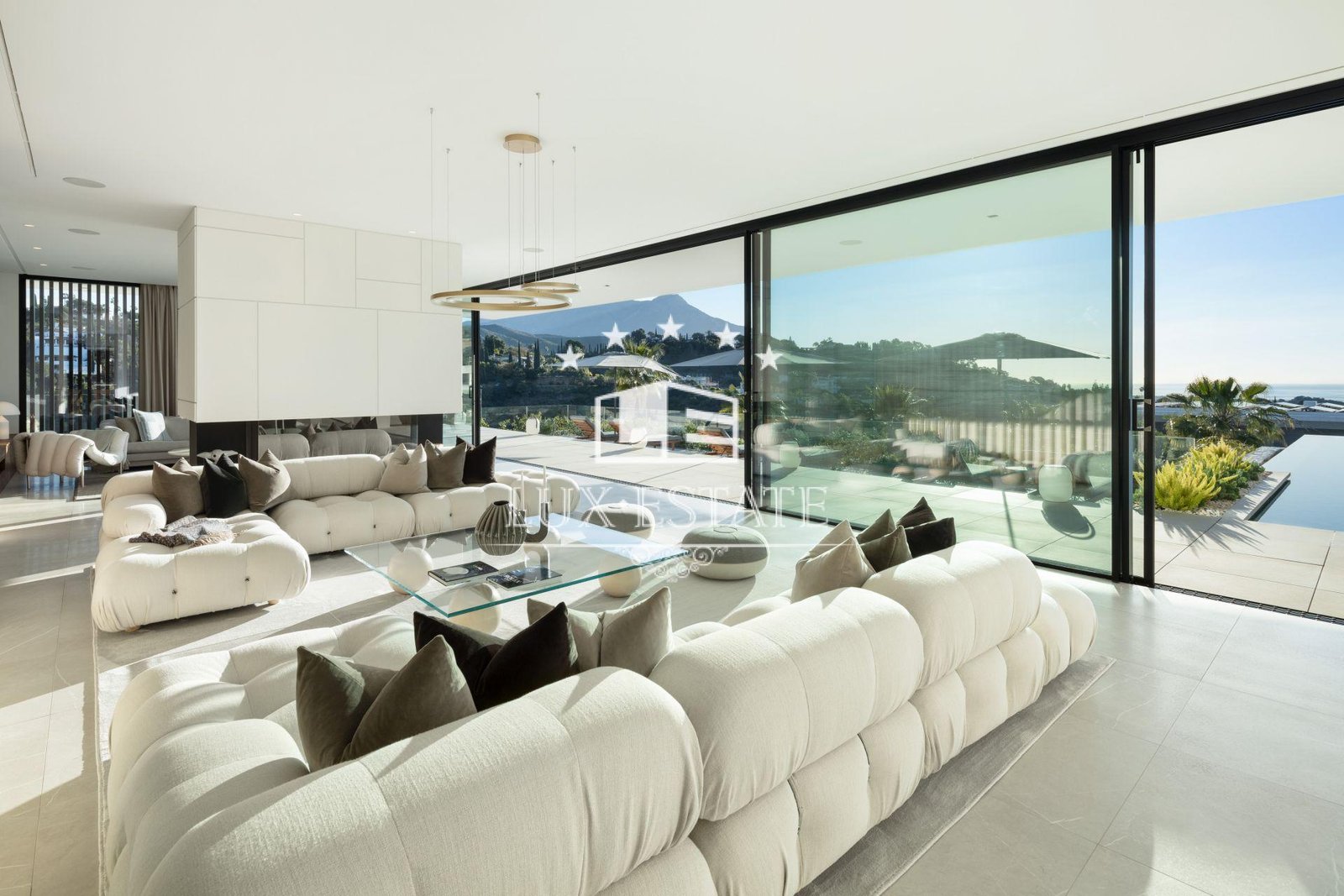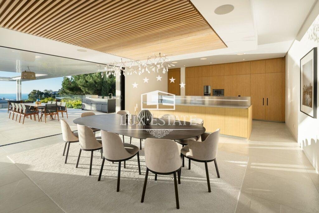 The home features eight expansive en-suite bedrooms along with two additional guest bathrooms, ensuring ample space for both residents and visitors. An open-concept floor plan connects the stylish living and dining areas with a cutting-edge Gaggenau kitchen outfitted with top-tier appliances. Soaring ceilings and floor-to-ceiling windows flood the interiors with natural light and frame the stunning sea views, while a sleek modern fireplace adds both warmth and ambiance to the main living space.
