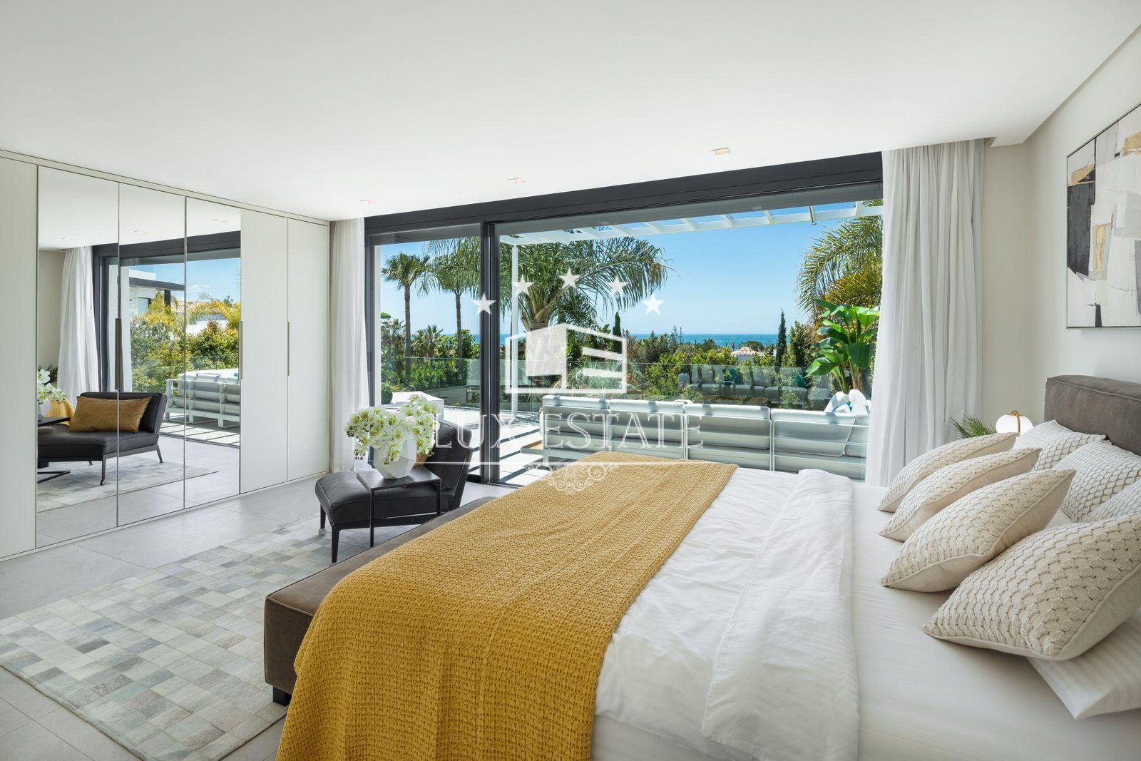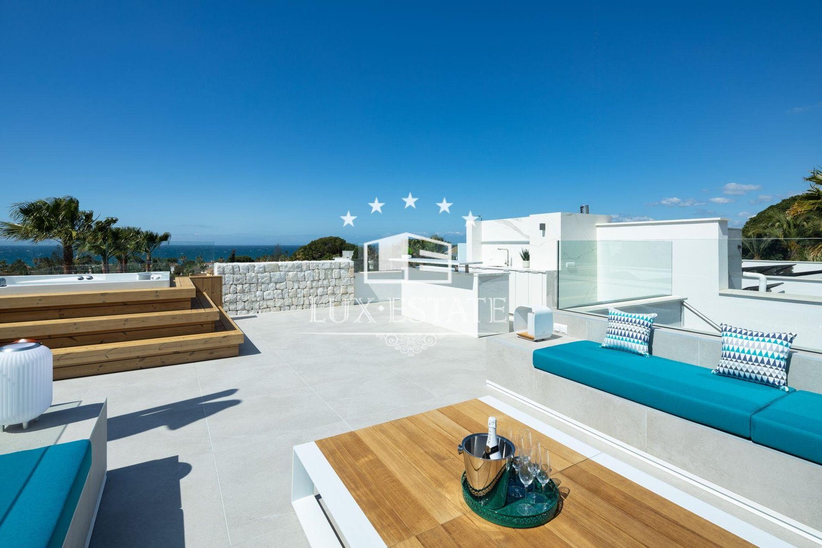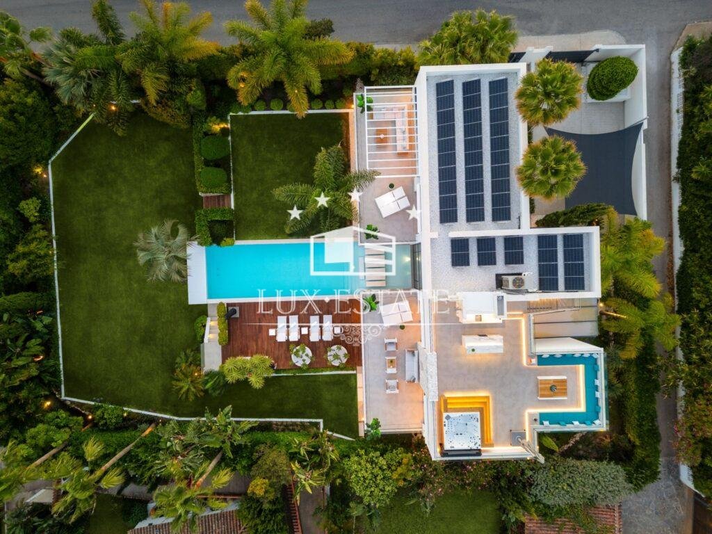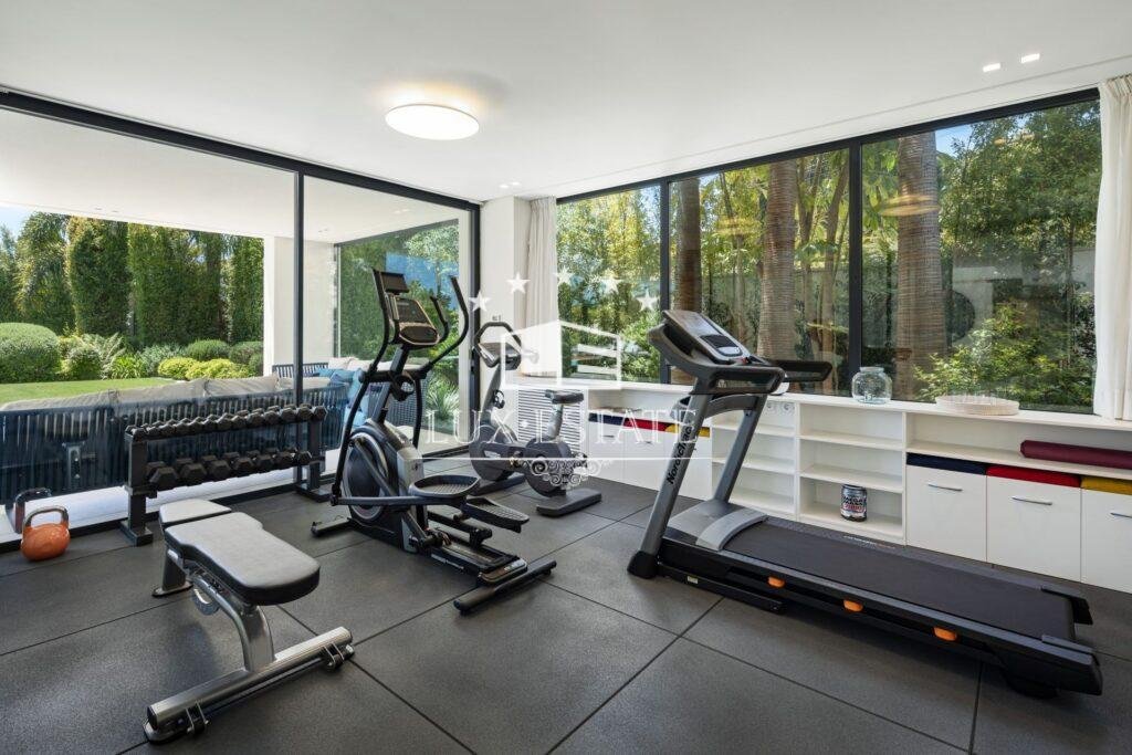 A private gym with garden views enhances your wellbeing, ensuring every workout is an inspiration. The rooftop features a high-end jacuzzi, comfortable seating area, and a bar where you can enjoy enchanting sunsets with sea views. Each of the four bedrooms is designed for maximum comfort, especially the expansive master suite, which offers a luxurious retreat.