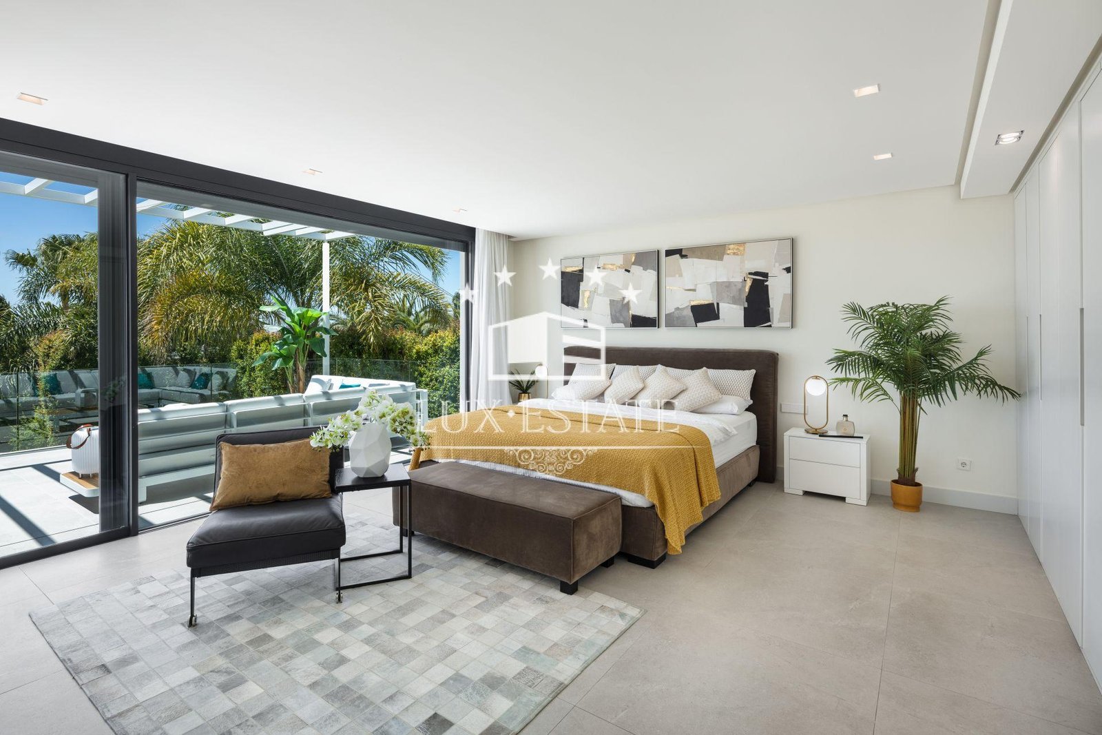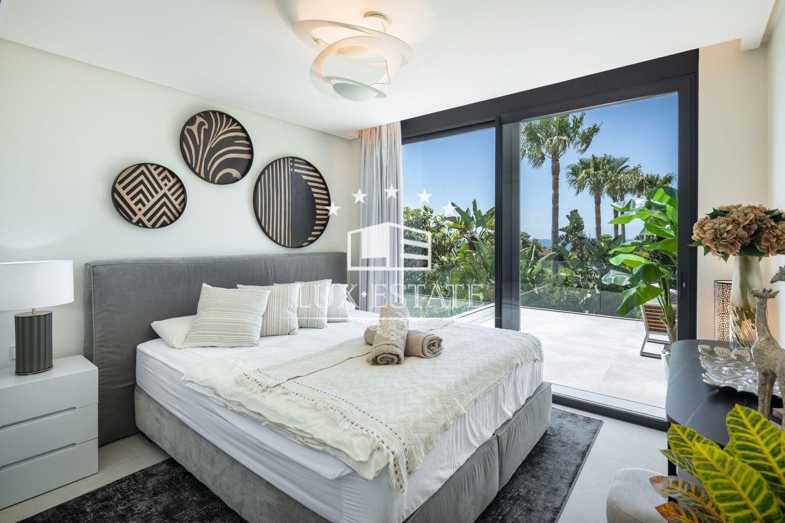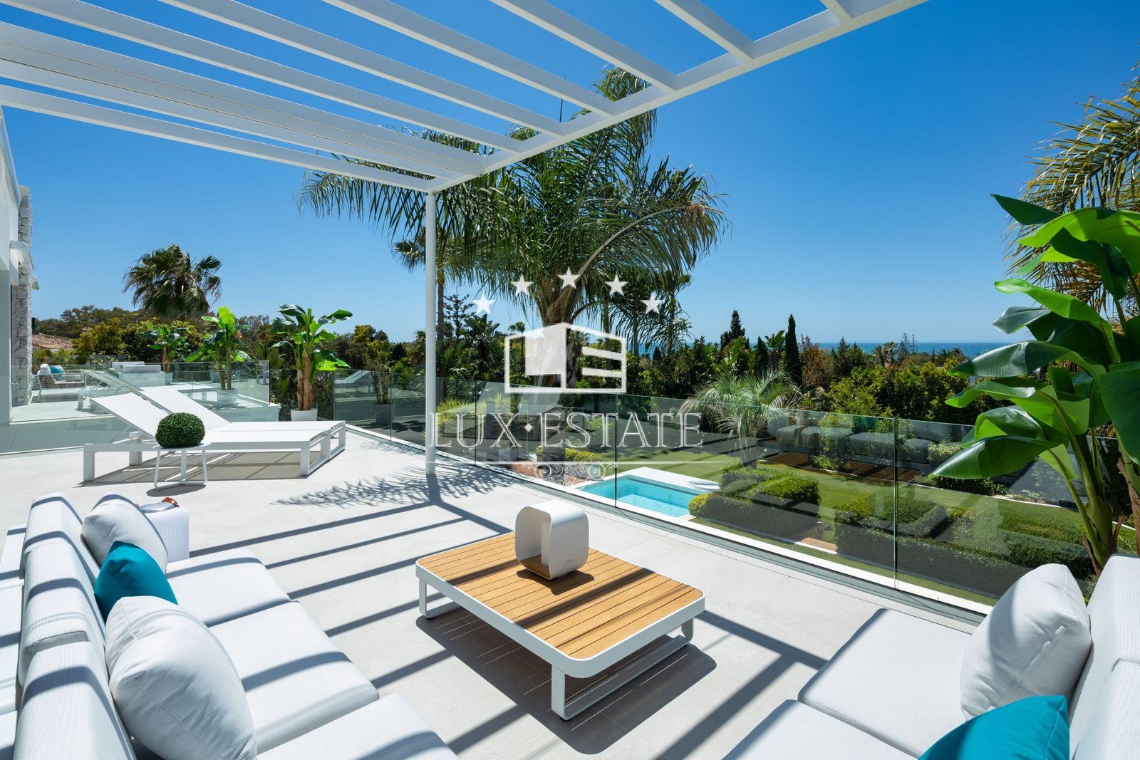A private gym with garden views enhances your wellbeing, ensuring every workout is an inspiration. The rooftop features a high-end jacuzzi, comfortable seating area, and a bar where you can enjoy enchanting sunsets with sea views. Each of the four bedrooms is designed for maximum comfort, especially the expansive master suite, which offers a luxurious retreat.