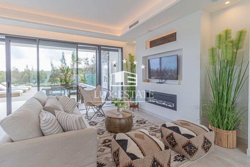 Open-plan living area with a bioethanol fireplace and dining space, leading to a contemporary, fully-fitted kitchen. The living area extends onto a sheltered veranda with an infinity pool and a secluded garden.
