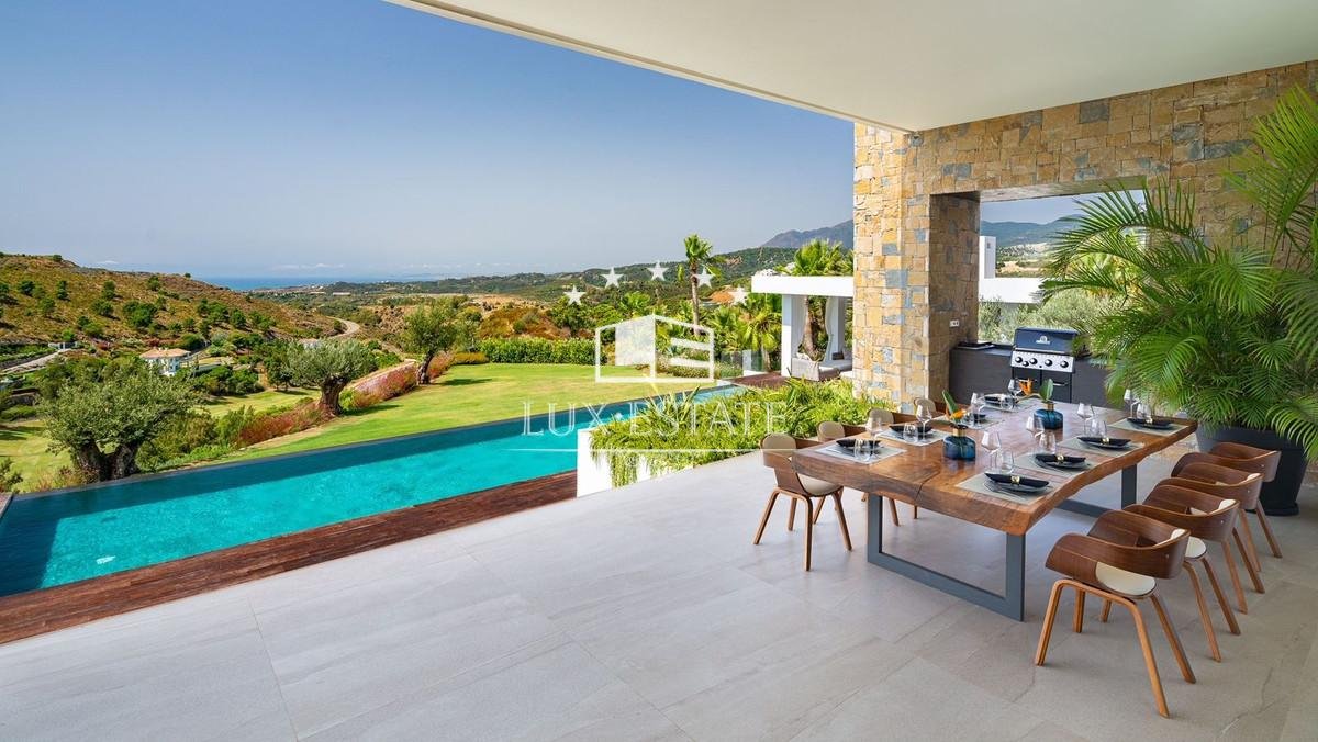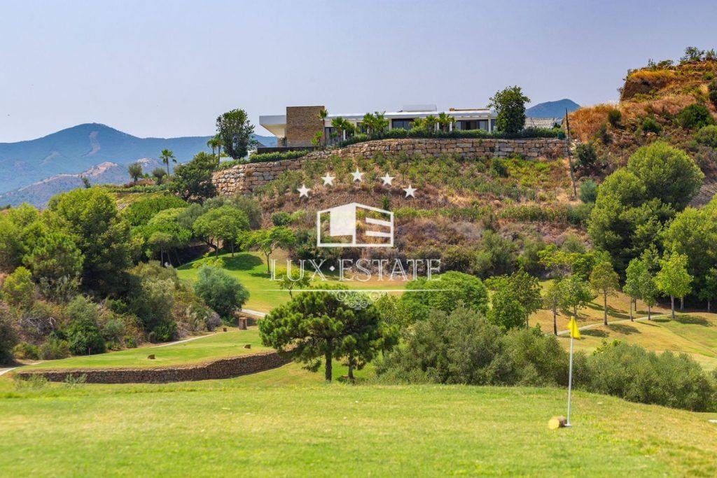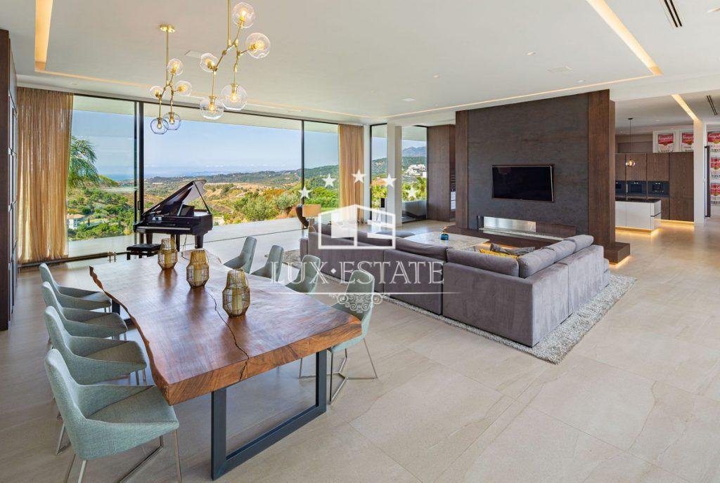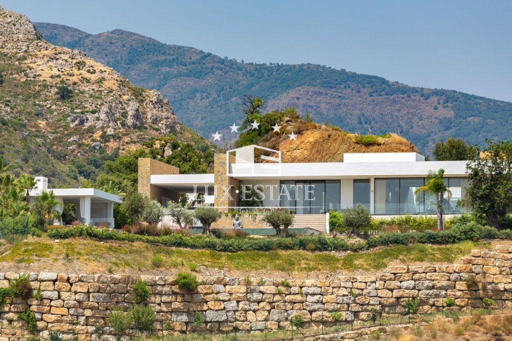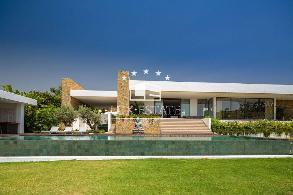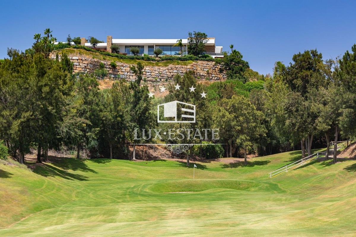 Outstanding contemporary villa frontline golf in Marbella Club Golf Resort with panoramic sea and mountain views. This fabulous Villa built on a plot of 6000m2 and with 1370m2 built, offers you 6 bedrooms and 9 bathrooms, fully fitted kitchen, central heating, integrated sound system, Domotic system and separate staff quarters.