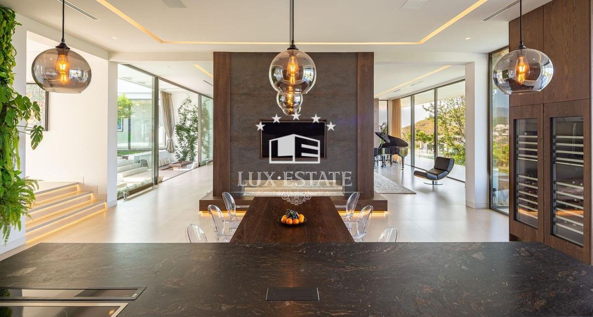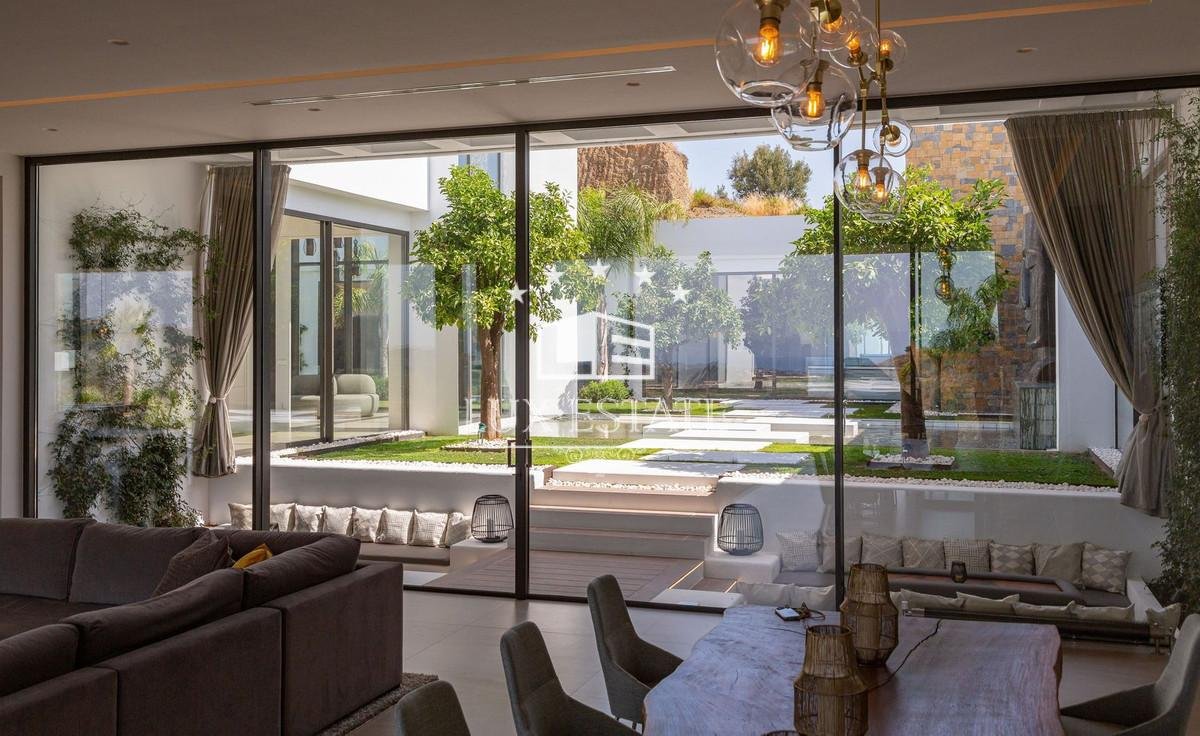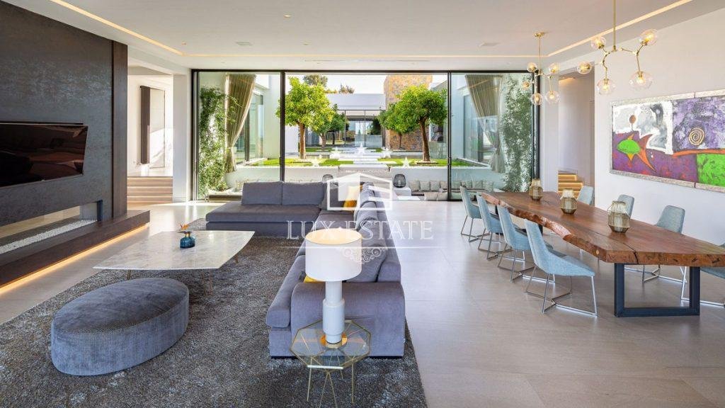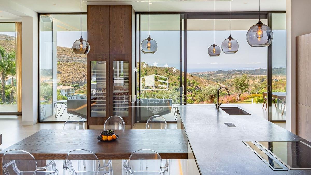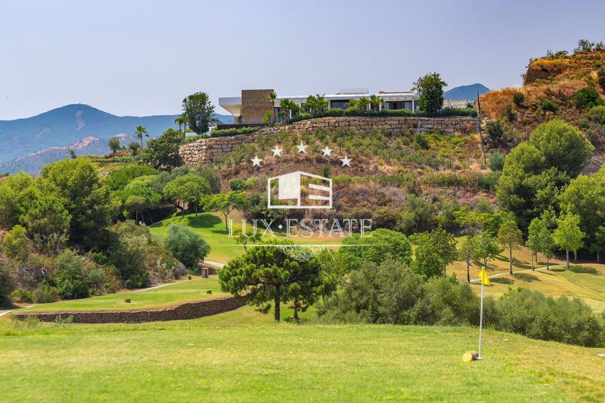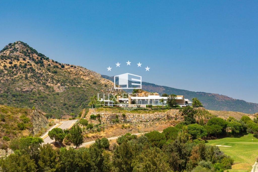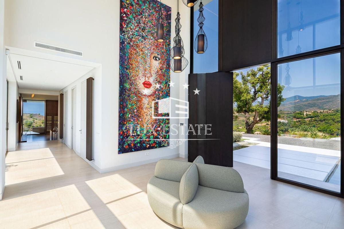Outstanding contemporary villa frontline golf in Marbella Club Golf Resort with panoramic sea and mountain views. This fabulous Villa built on a plot of 6000m2 and with 1370m2 built, offers you 6 bedrooms and 9 bathrooms, fully fitted kitchen, central heating, integrated sound system, Domotic system and separate staff quarters.