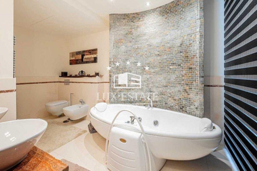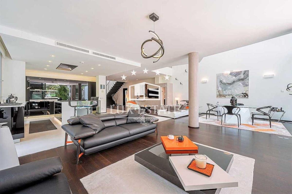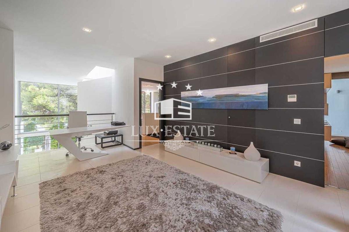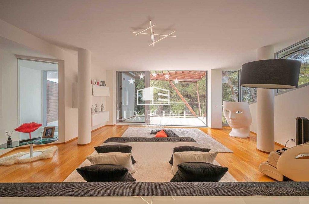 The spaciousness and the height of the ceilings, make our living room a very large space to enjoy, giving it a very personal style of decoration proposed by Roche Bobois. We have an open and modern kitchen equipped with the latest Miele appliances. We complete the ground floor with a bedroom with en suite bathroom and a small guest toilet, a library with access to the laundry room, a small sitting room, a TV and music room, a small storage room and the garage with space for two cars. Access to the upper floor is via a modern and comfortable staircase or the interior lift, where we are welcomed by an elegant office leading to the two large bedrooms on the upper floor, especially the master bedroom, with a luxurious en-suite bathroom. All the bedrooms in the house have access to a small outdoor terrace.