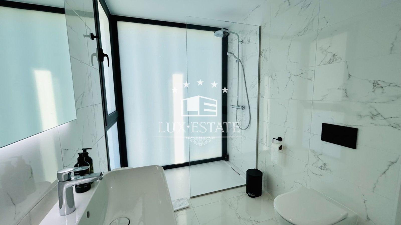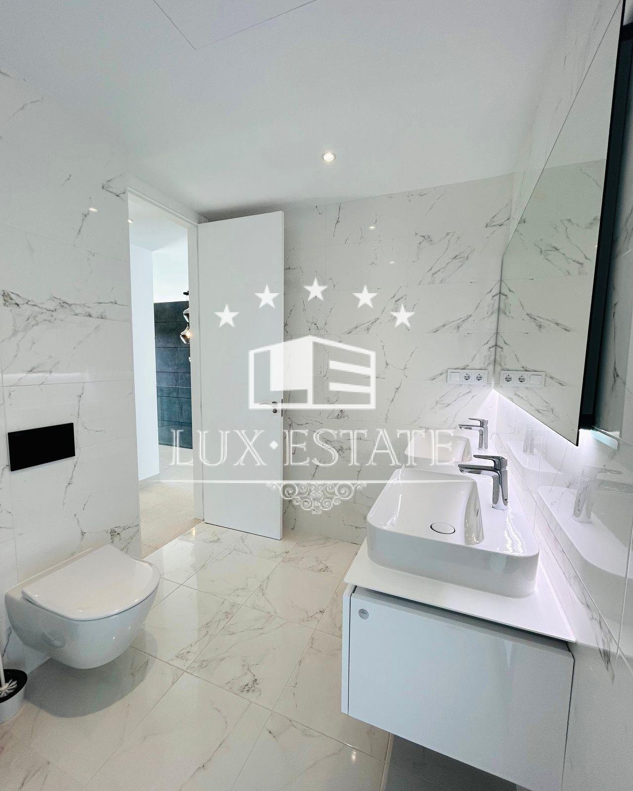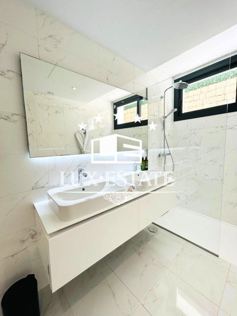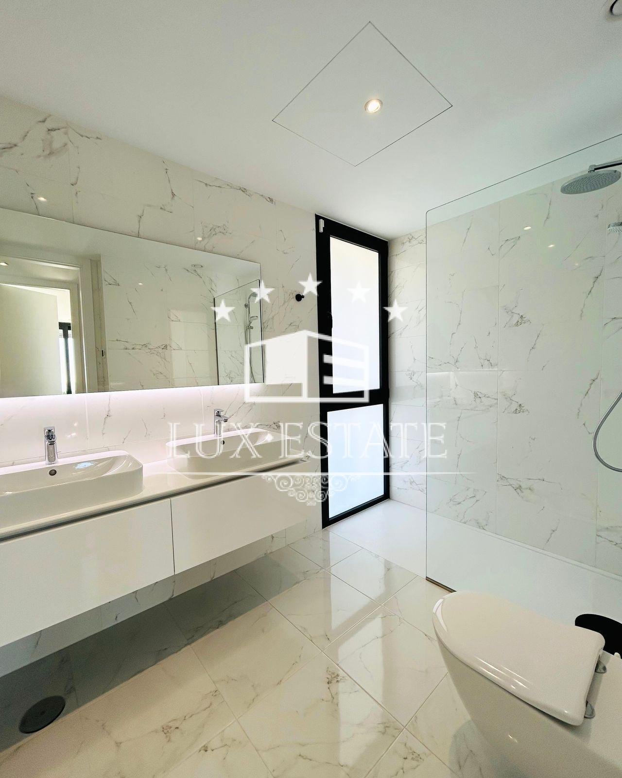 The villa also houses five pristine bathrooms. The villa is equipped with four modern bathrooms and a guest bathroom featuring underfloor heating, sleek finishes, and premium fixtures. Enjoy spa-like experiences in the comfort of your own home.