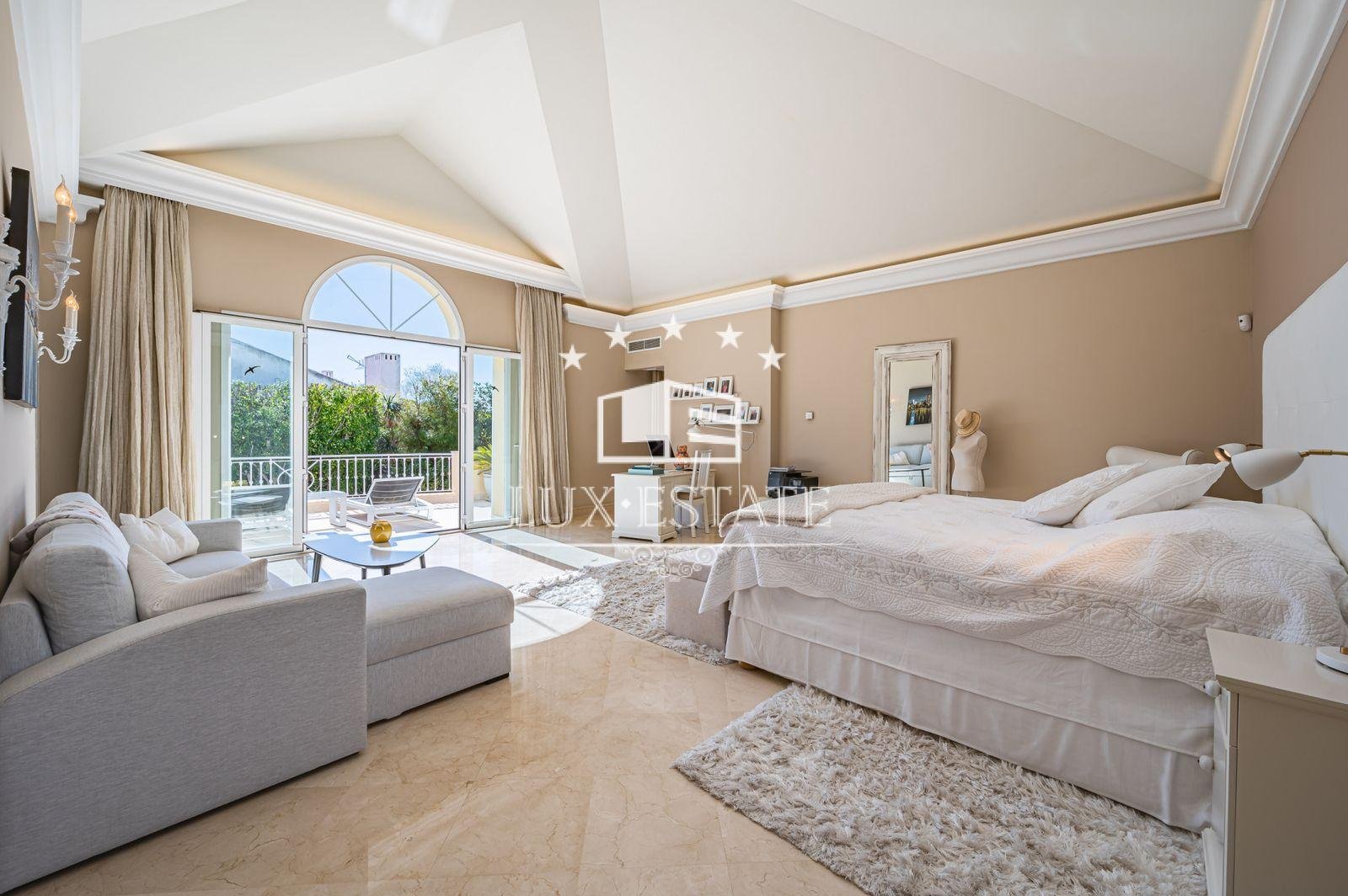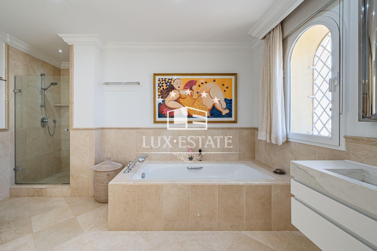 As soon as you open the front door, you will be welcomed by a stunning entrance with a domed ceiling that leads to an extensive floor plan. The kitchen and living area combination showcases a centre island and a nearby breakfast nook, an open-plan family room complete with a fireplace and a dining area. Sliding doors made of glass lead onto the garden, providing an ideal indoor-outdoor living experience. There is a sizable guest suite and a lavatory on this level. The upper level solely consists of the main suite with a magnificent domed ceiling, a genuine oasis. A delightful dressing room and a terrace extending the length of the house are also present, great for enjoying morning coffee and taking in the sea breeze whilst catching up on news. On the lower level, there are three bedrooms with plenty of natural light, a bathroom, a storage room and a laundry room. The secluded and beautifully designed exterior boasts a well-maintained landscape that encompasses a heated pool, an outdoor shower and a BBQ area. Furthermore, the property is fully equipped with both warm and cold AC, underfloor heating and a single-car garage.
