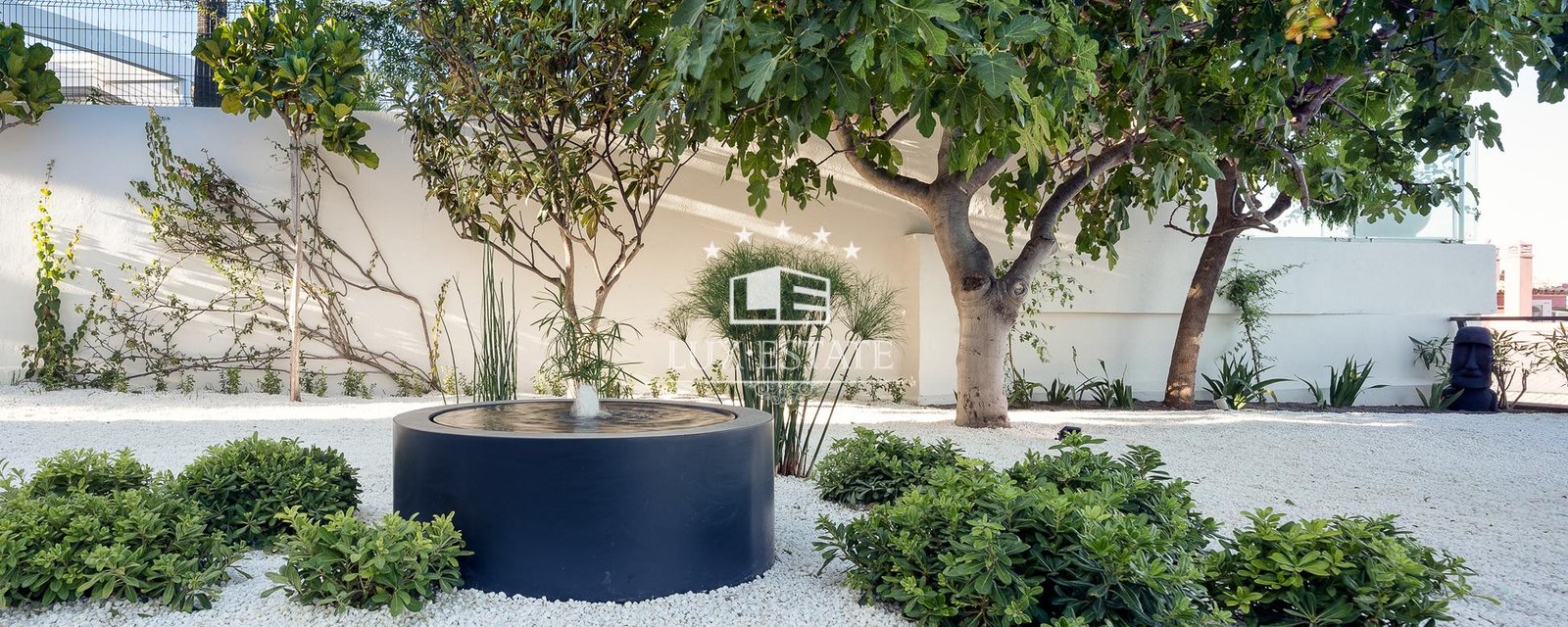 shower. The master bedroom also includes a sleek and spacious walk-in wardrobe. This floor has 3 more en-suite bedrooms, each elegantly decorated with built in wardrobes. The large sliding doors in the main living room open up to the terrace with a covered porch, barbecue area, charming modern swimming pool and a big open garden with beautiful plants, flowers and mature fruit trees. You can access the basement from the garden. It includes a fully equipped gym, a toilet and a storage room. The property also includes an independent en-suite guest house with its own access.