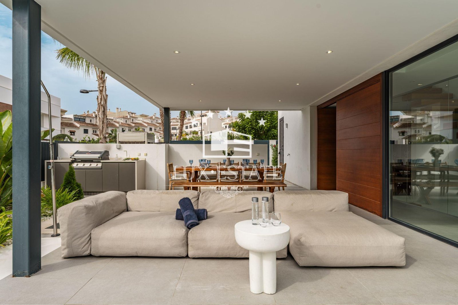 Outdoors, Villa Belle shines just as brightly. A saltwater infinity pool, pre-installed for heating, blends beautifully into the landscape, while a fully equipped outdoor kitchen and BBQ area make al fresco living effortless. The south-facing orientation ensures sunlit interiors and terraces all year round.