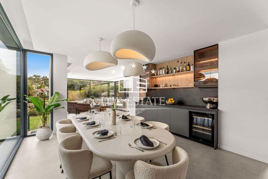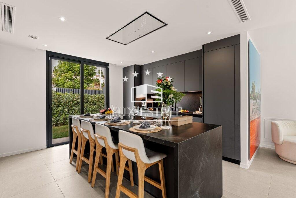 Inside, the villa features five spacious bedrooms, four of them en suite, along with three additional bathrooms and a guest toilet. The interiors exude minimalist elegance, warmed by natural textures, soft tones, and premium finishes. At its heart lies a stunning open-plan living area with a designer Miele kitchen, seamlessly flowing onto a large terrace overlooking the lush fairways — perfect for family gatherings or entertaining guests.