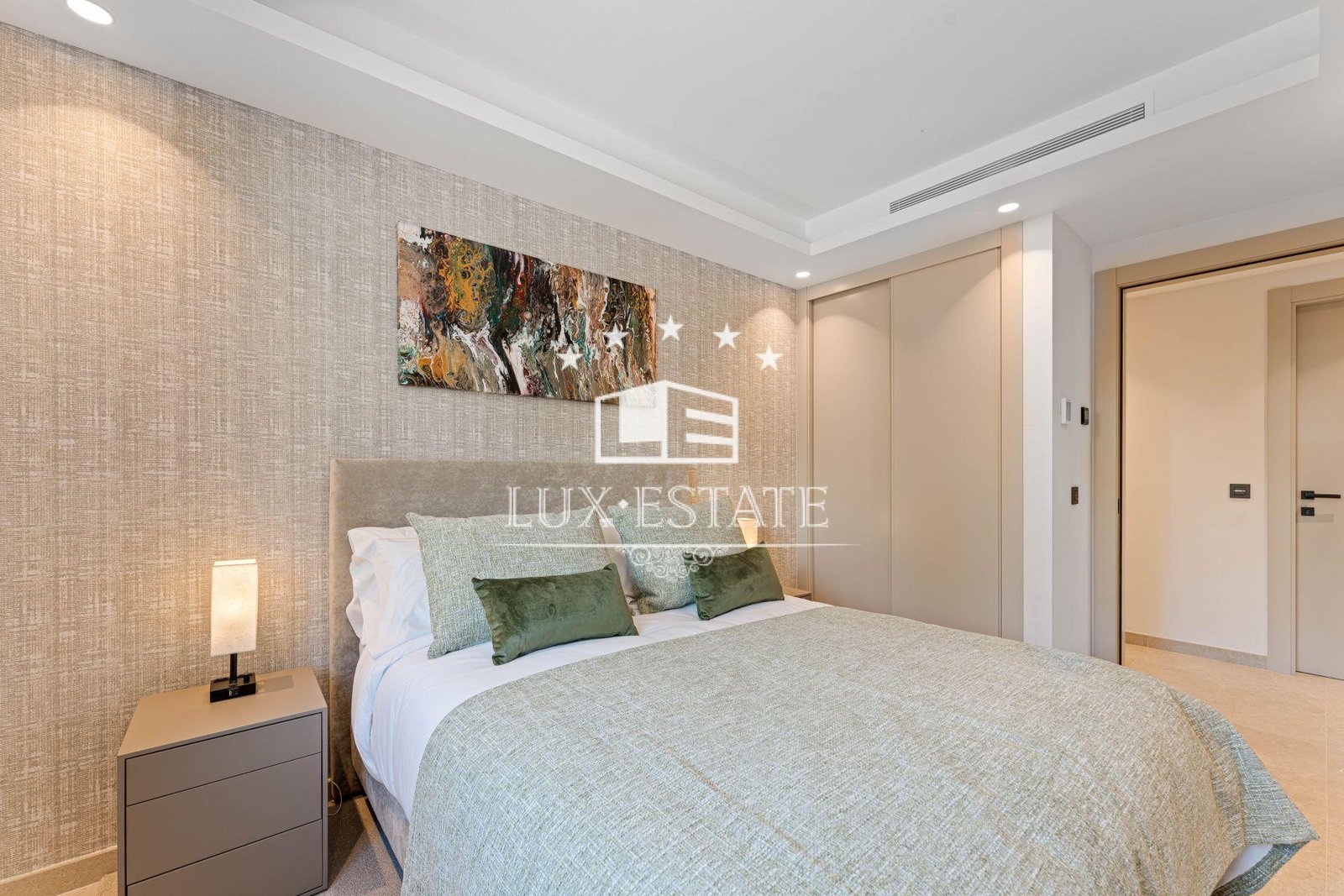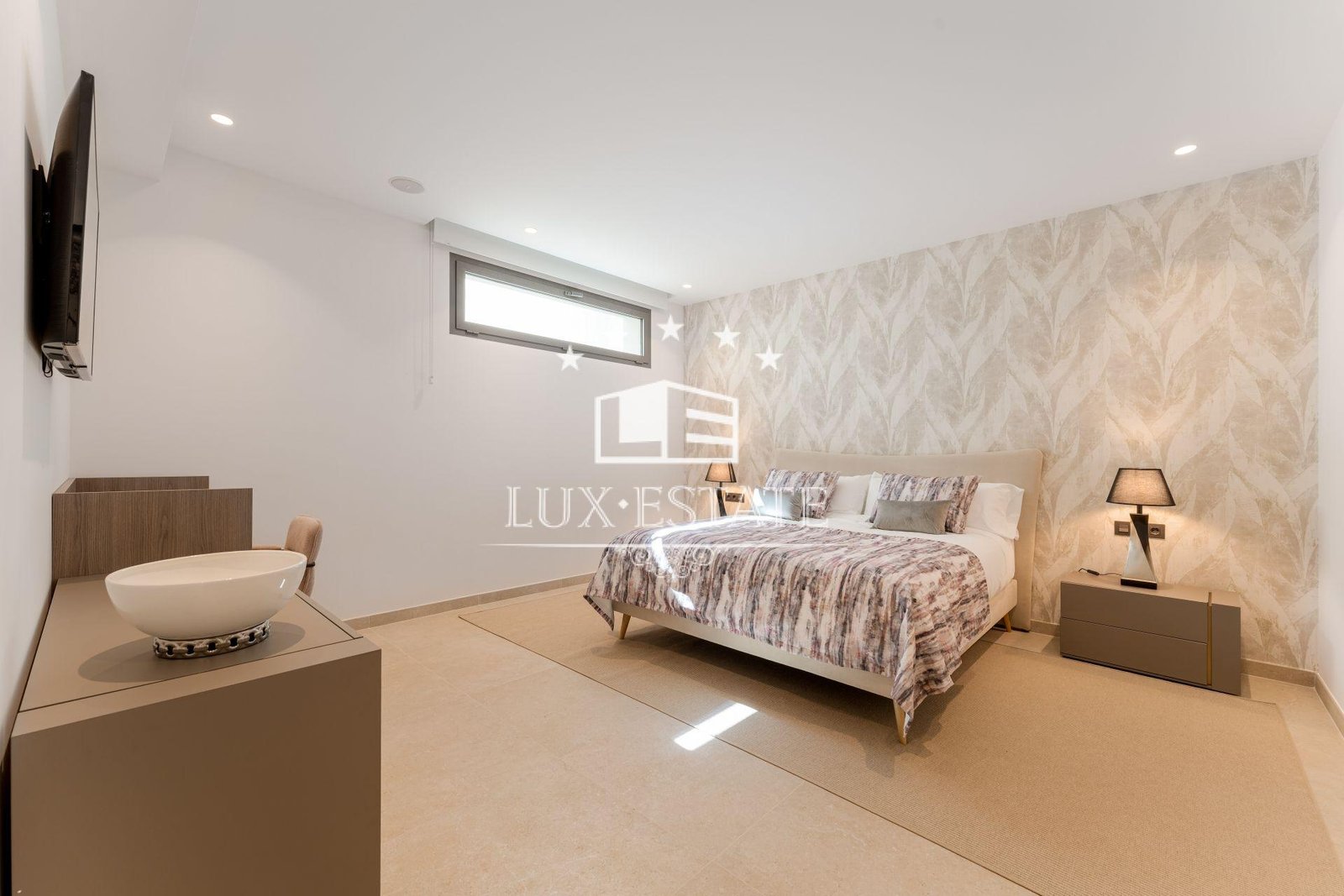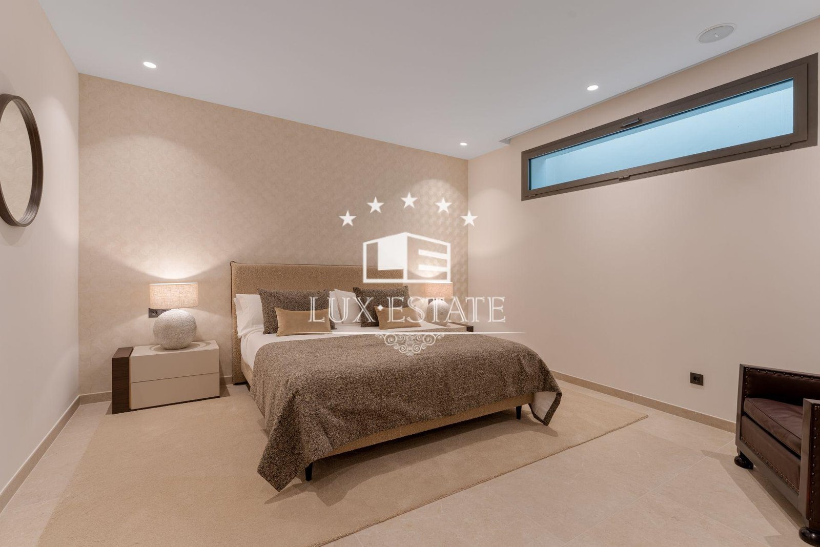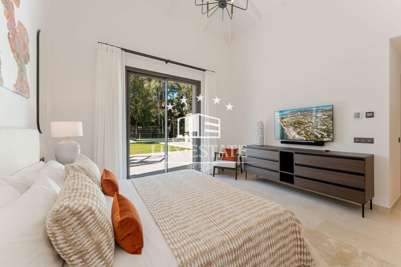 Three en-suite bedrooms, each with large windows overlooking the terraces and landscaped garden