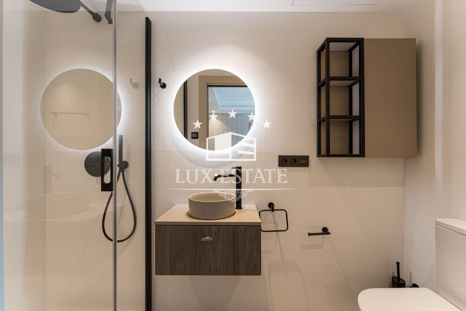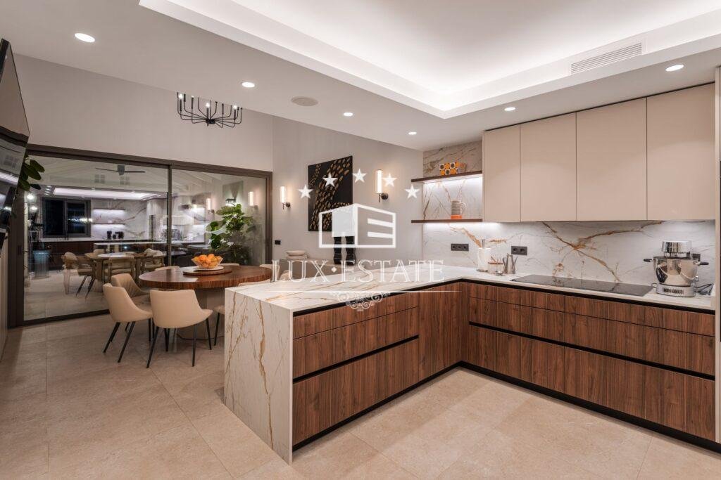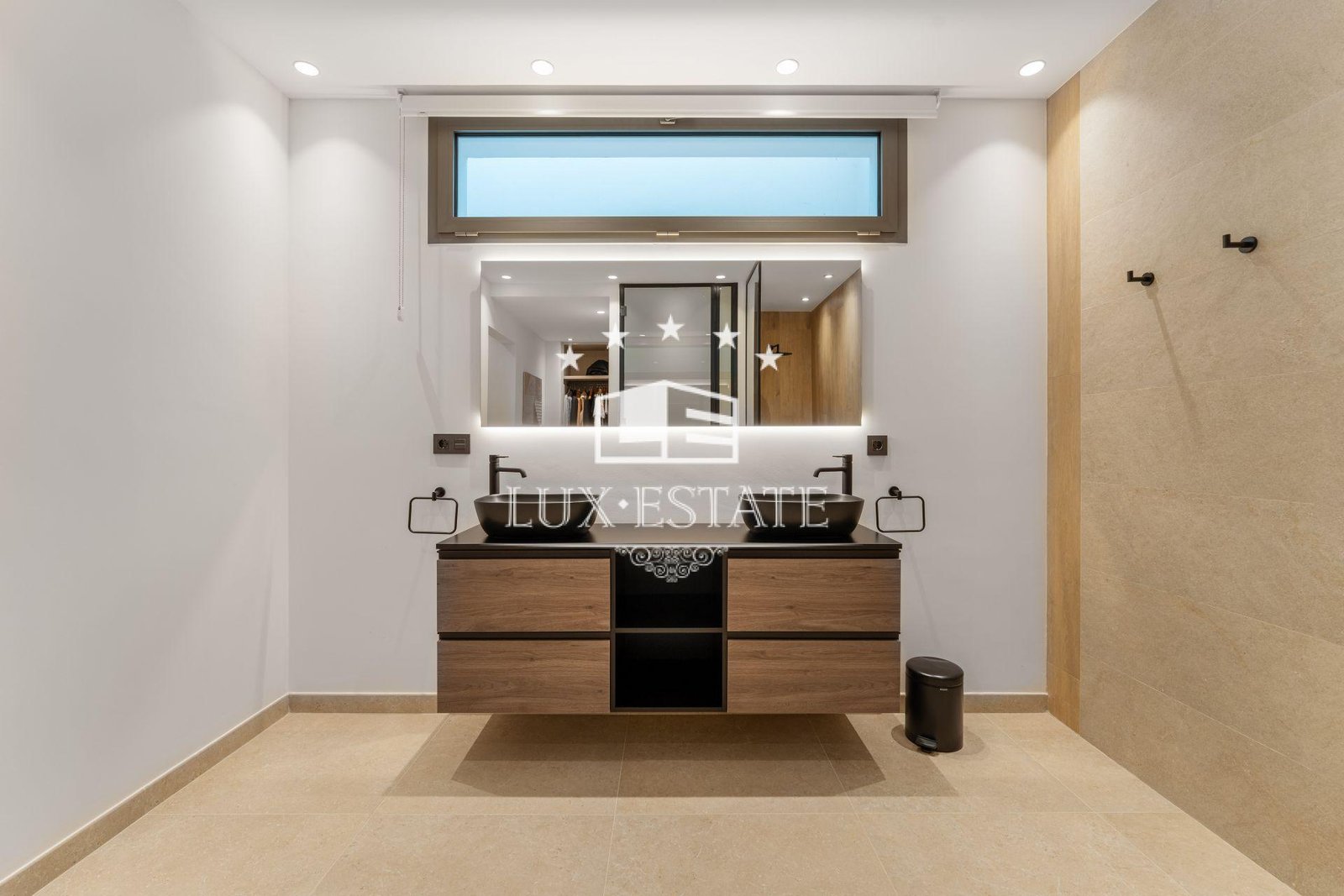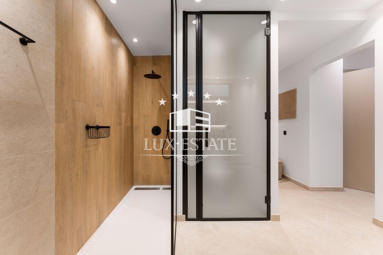 Warm natural materials, wood accents, and refined tilework throughout