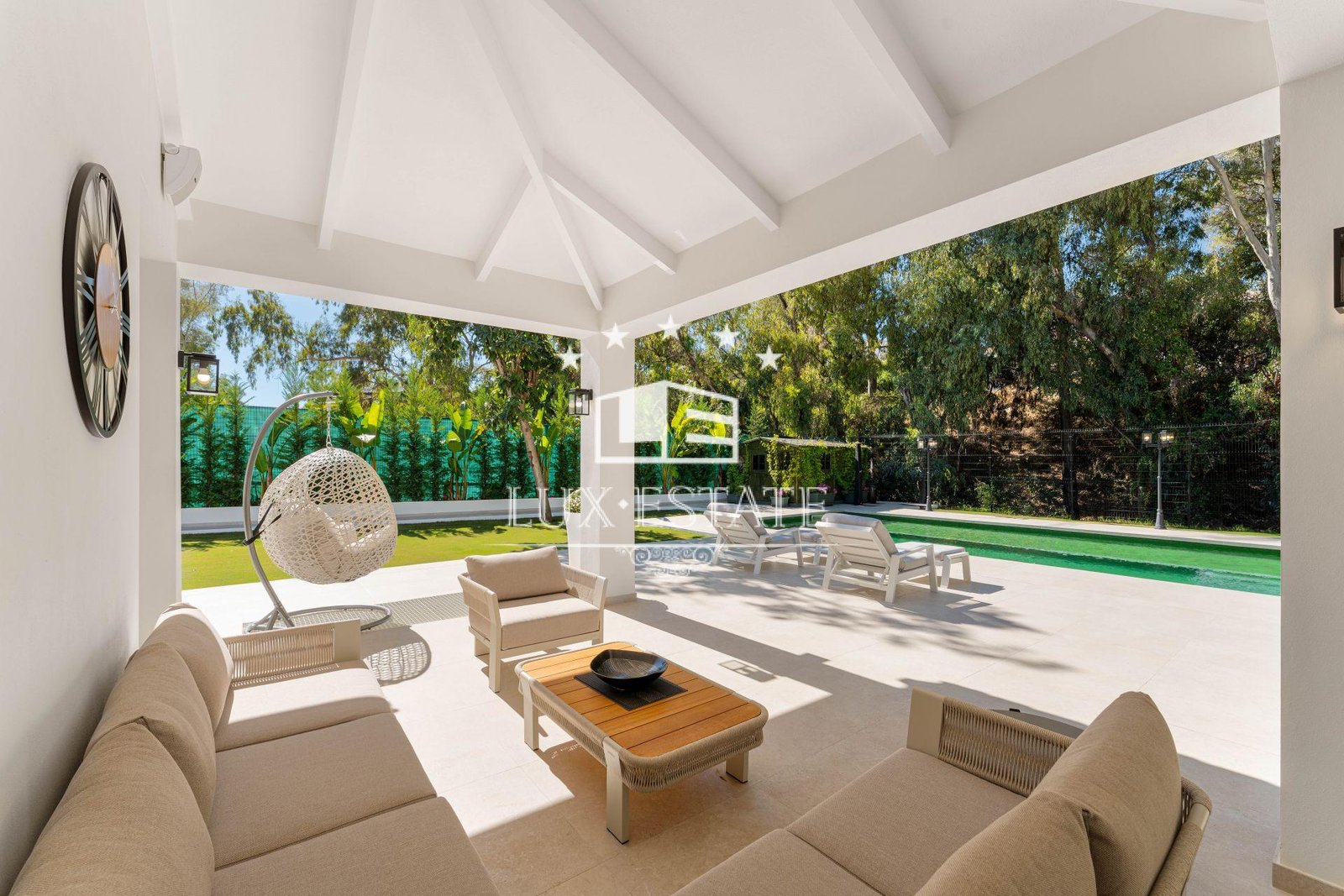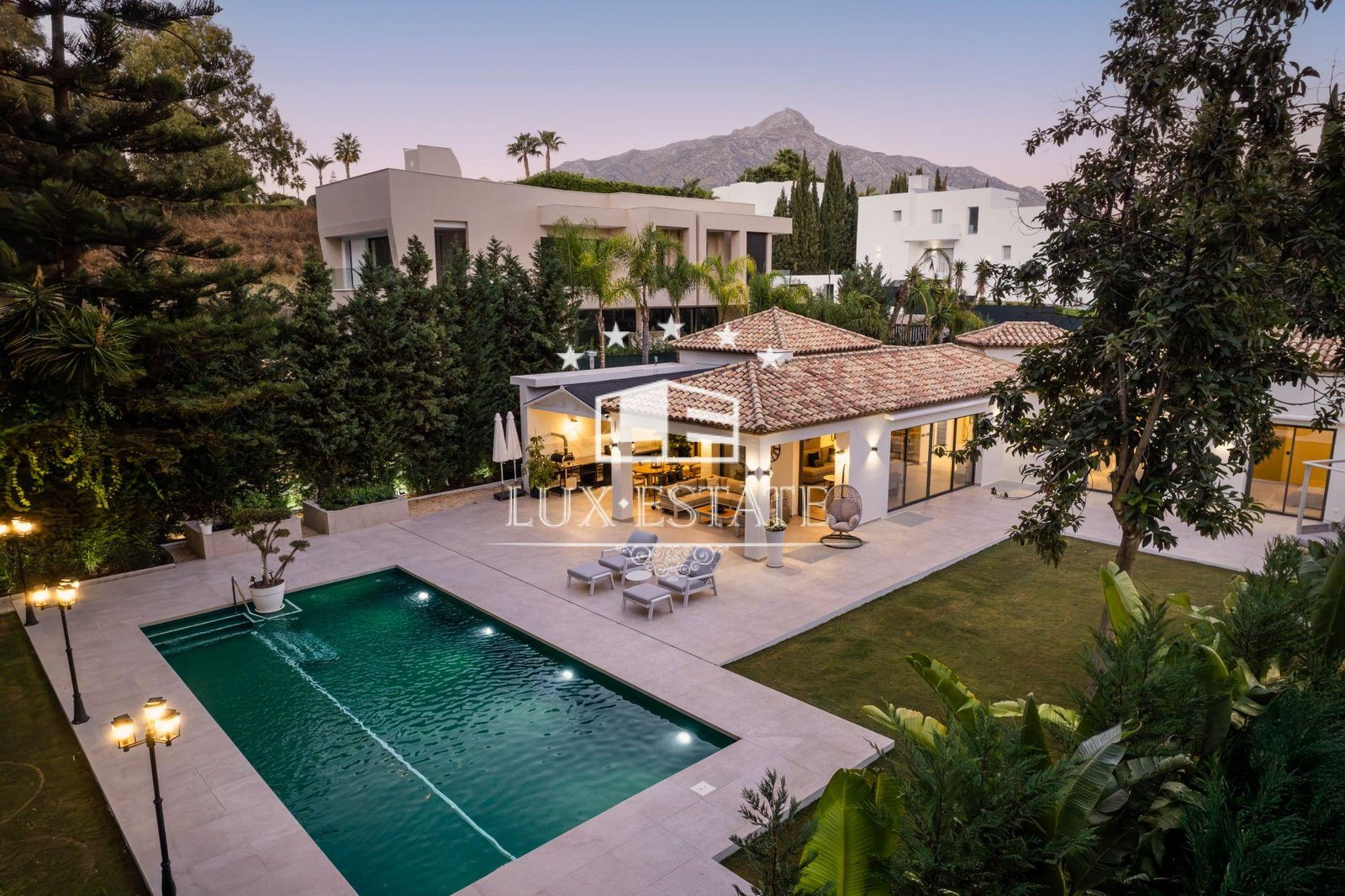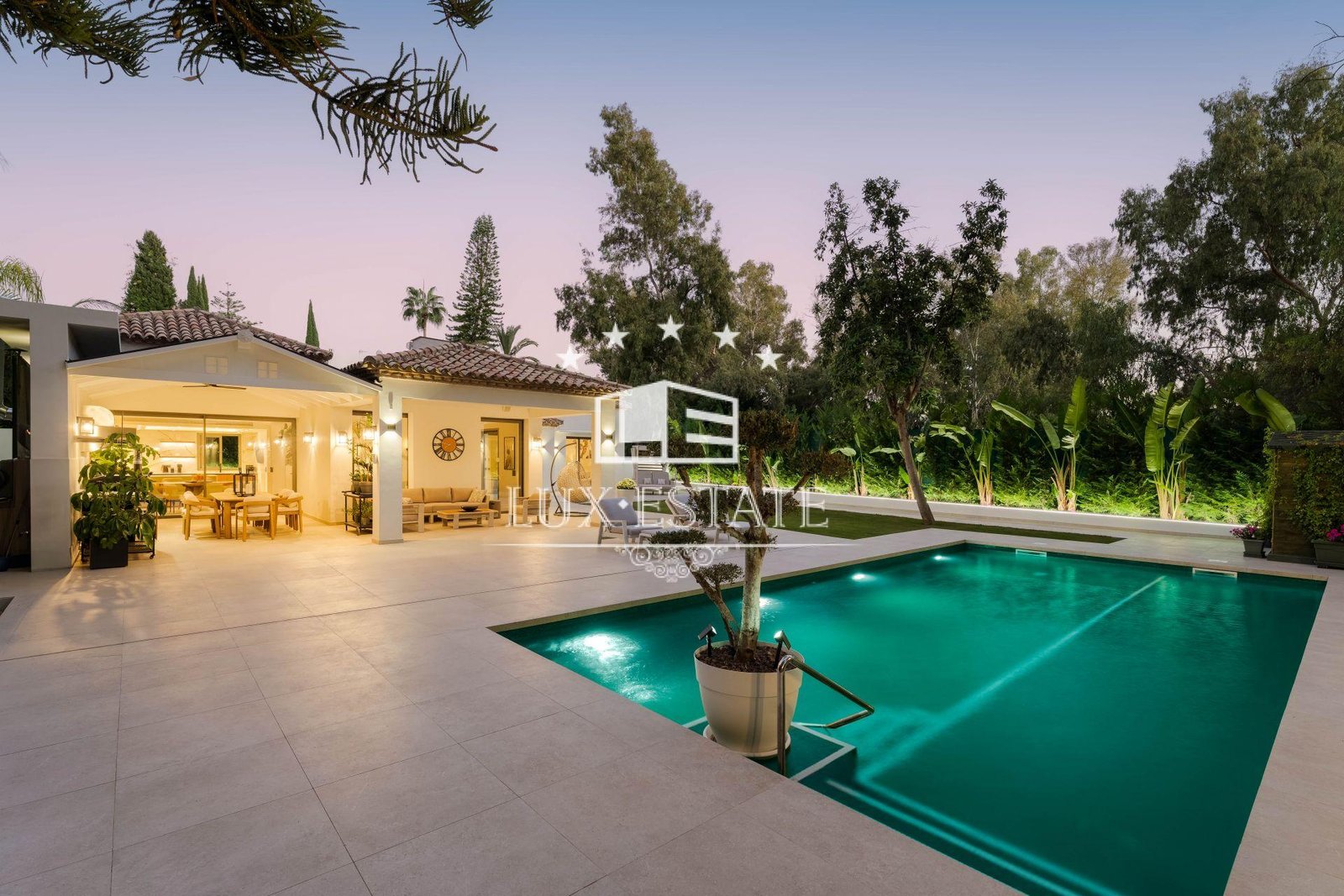 A beautifully landscaped garden surrounds the private swimming pool, which is pre-installed for heating. Expansive terraces offer: