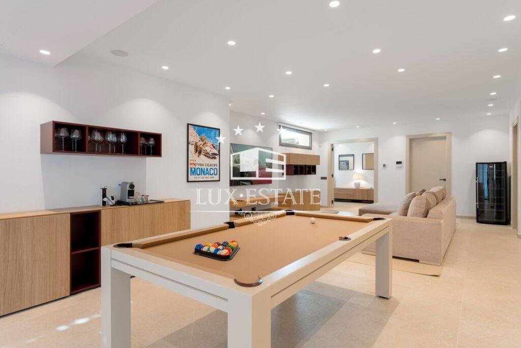 A stylish games room with lounge area and pool table