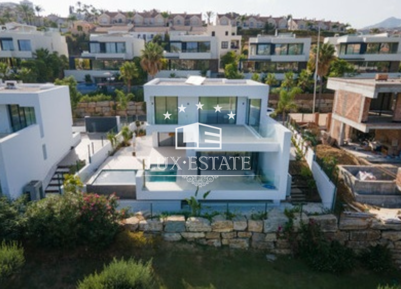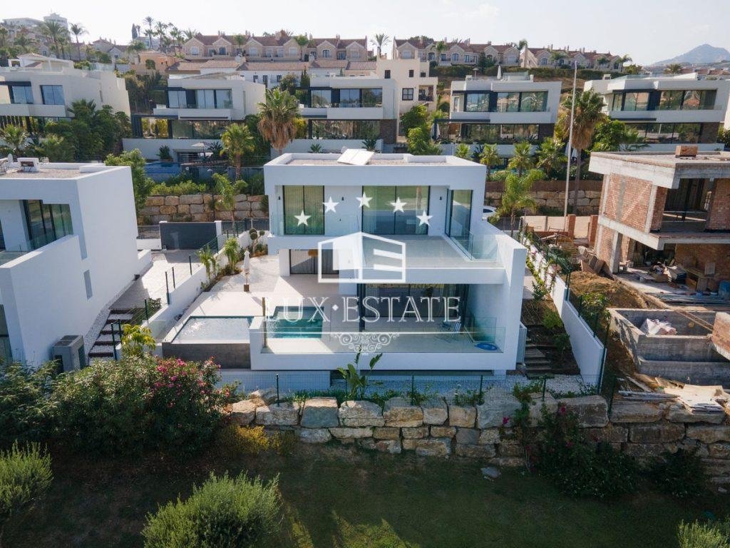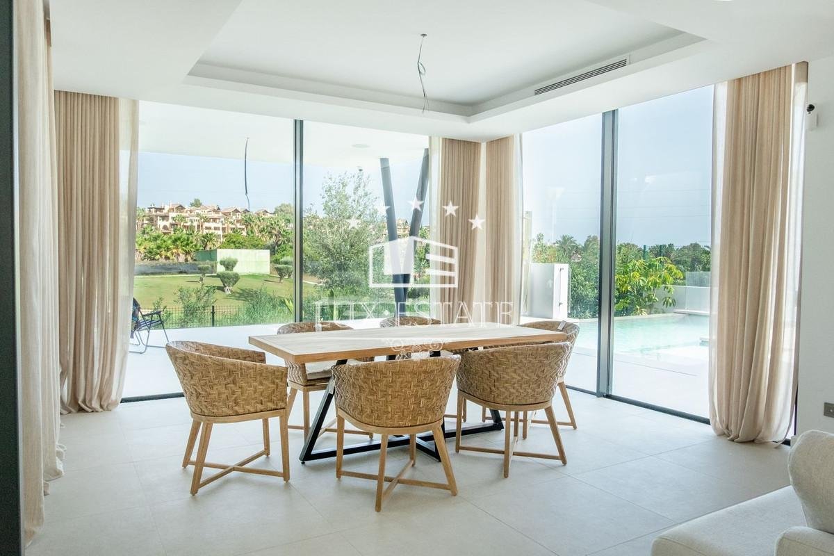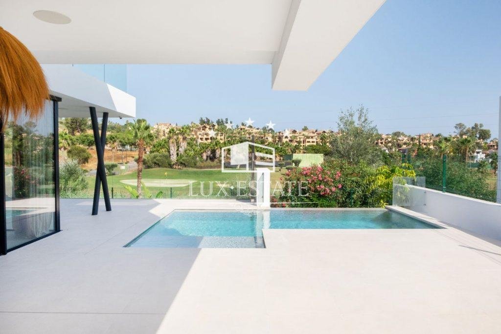 Villa for sale in El Campanario, Estepona with 4 ensuite bedrooms and with orientation south/east, with private swimming pool, private garage and private garden. Regarding property dimensions, it has 320 m2 built, 600 m2 plot, 270 m2 interior and 100 m2 terrace. Has the following facilities front line golf, amenities near, air conditioning, fully furnished, fully fitted kitchen, utility room, basement, storage room, alarm, security entrance, video entrance, brand new, security service 24h, private terrace, living room, golf view, laundry room, internet – wifi, covered terrace, fitted wardrobes, garden view, pool view, close to golf, glass doors, close to shops, close to town, close to schools, pets allowed and ground floor patio.