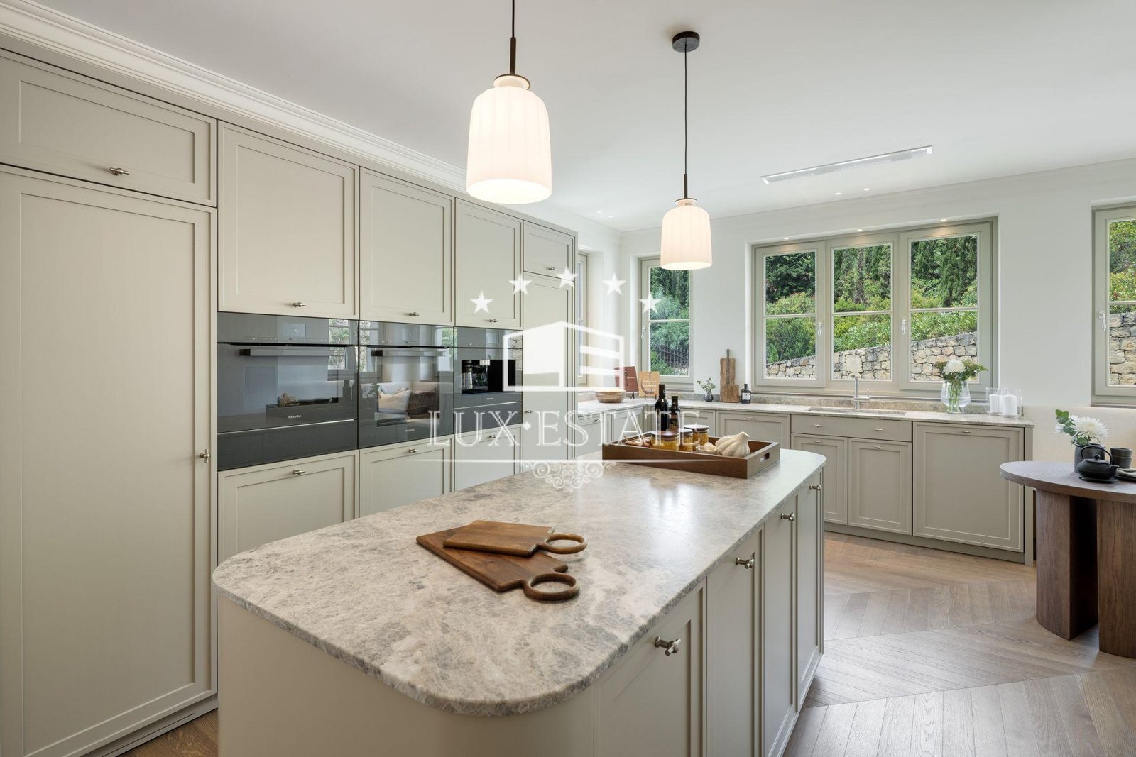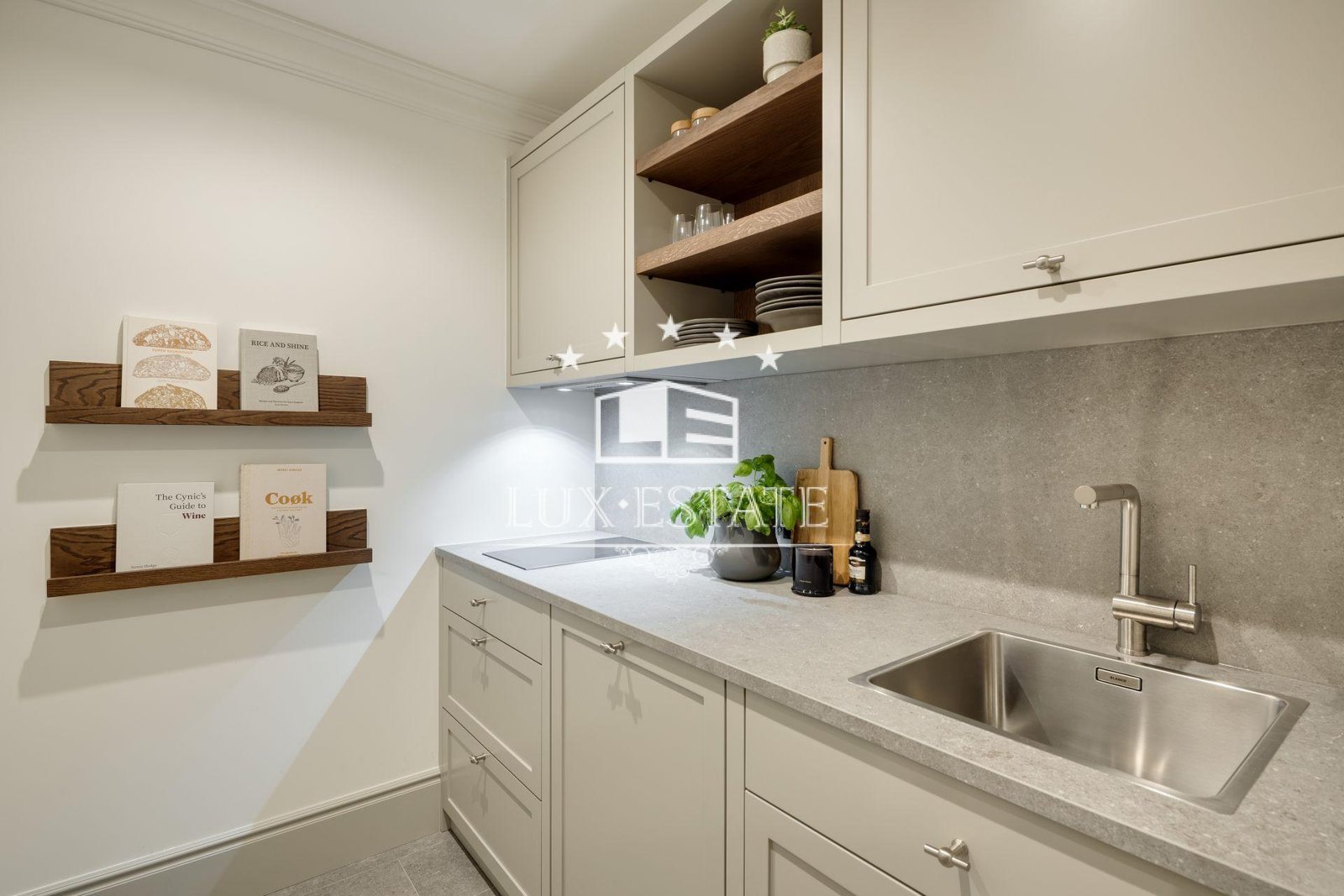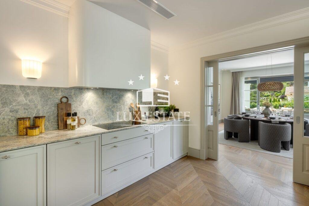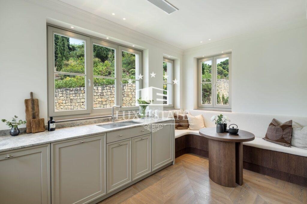The villa features a semi-open dining room that connects effortlessly to the south-facing terrace—complete with an outdoor kitchen and dining area, perfect for alfresco entertaining. The interior kitchen is equipped with premium Miele appliances and a cozy breakfast nook, combining functionality with sophisticated design.