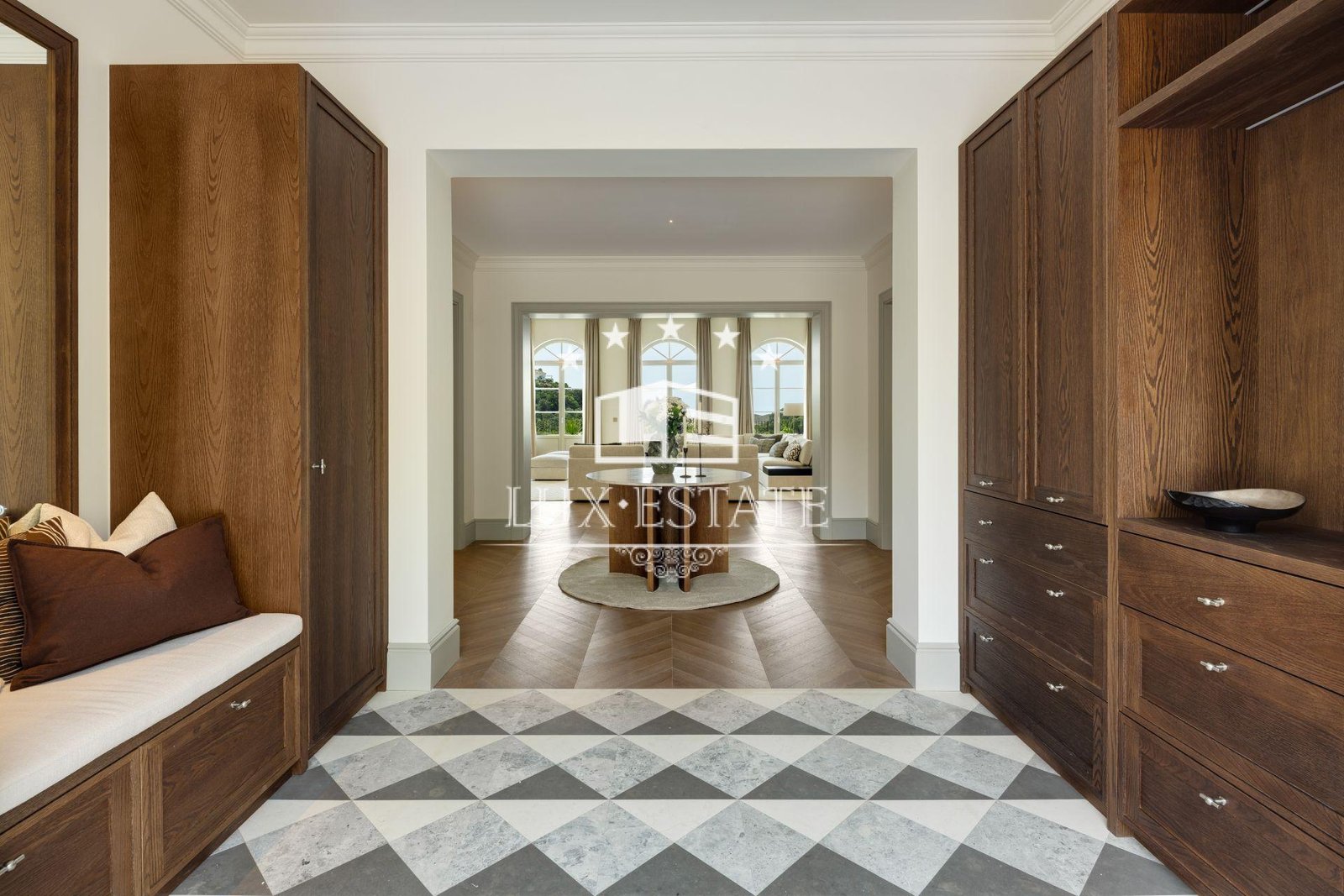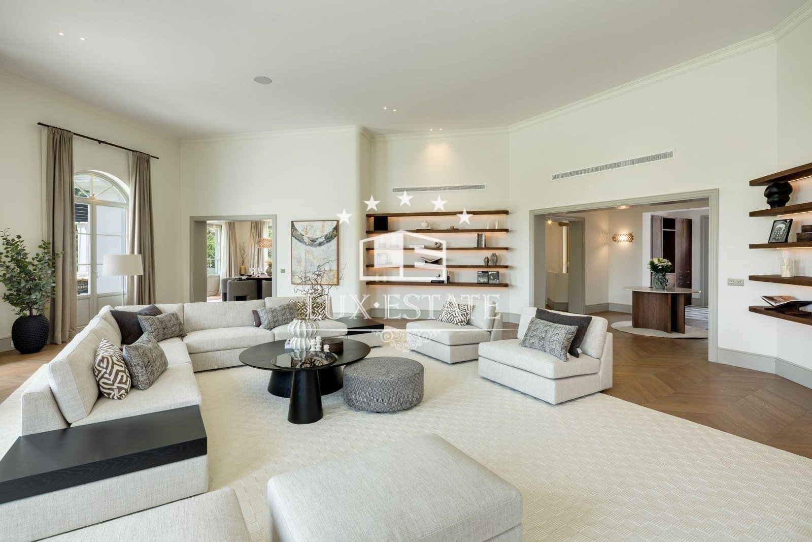 A striking bespoke entrance door with a glass panel ushers you into a welcoming reception hall, leading to the formal living room. With soaring ceilings and floor-to-ceiling Roman Clavero windows, the space is flooded with natural light and frames panoramic views of the landscaped gardens, swimming pool, and surrounding greenery.