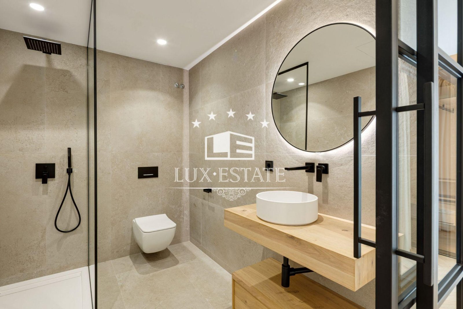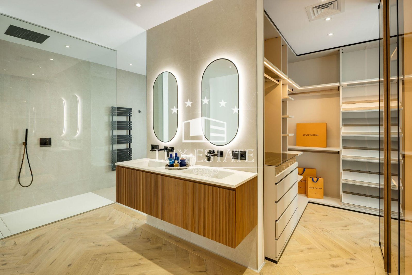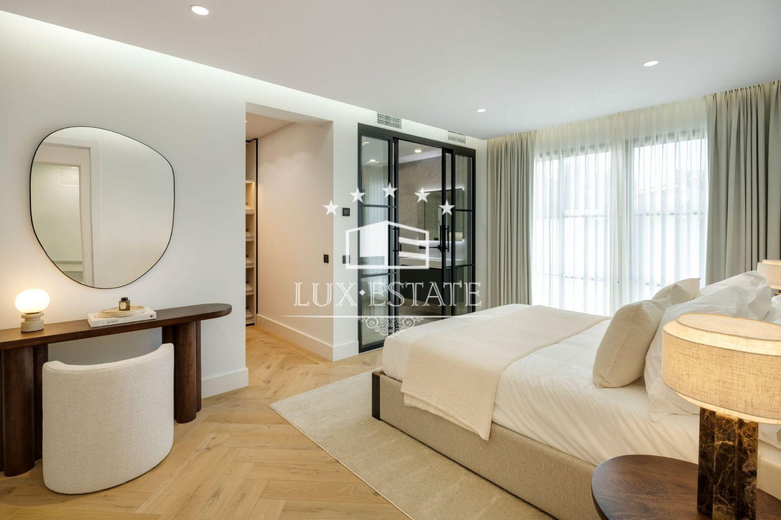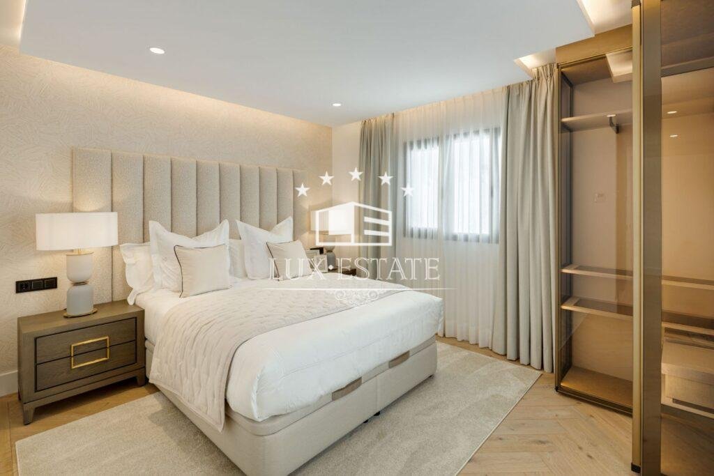 The master suite is a private sanctuary, complete with a custom walk-in wardrobe and a luxurious bathroom finished with Villeroy & Boch porcelain, Hansgrohe fixtures, a freestanding bathtub, and a spacious walk-in shower. All guest suites mirror this exceptional level of craftsmanship, featuring Uecko wardrobes and carefully selected designer details.