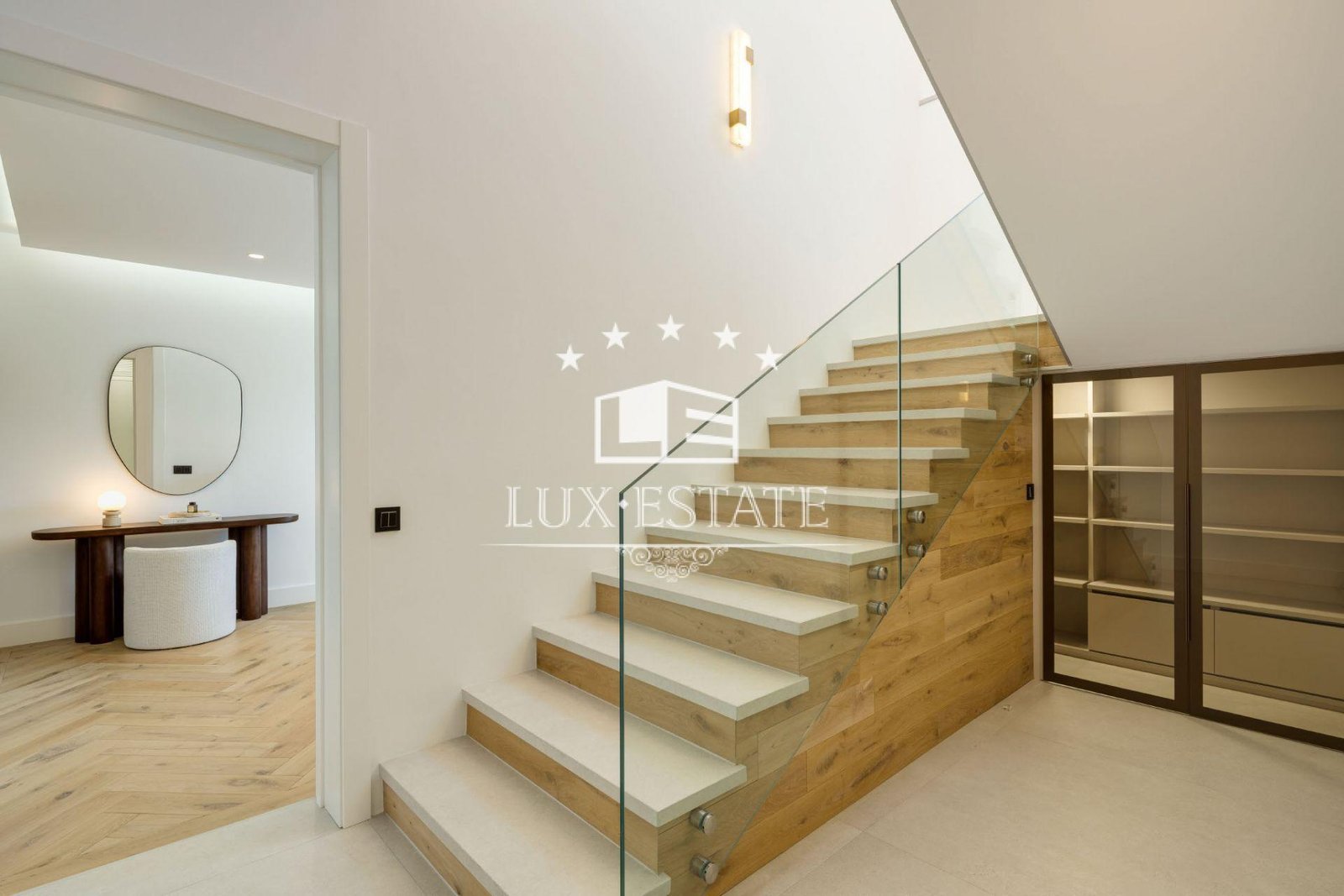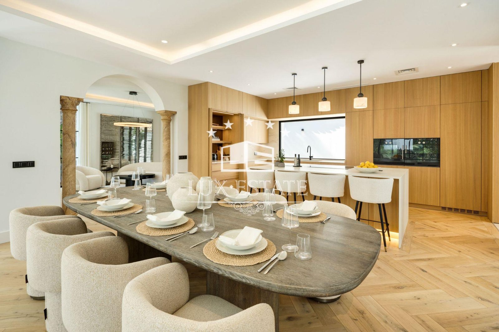 Two beautifully designed lounges provide flexibility for relaxed family moments or elegant entertaining. Each space features custom Eichholtz furnishings, offering a sophisticated yet welcoming ambiance. The formal dining area opens into a bespoke KoK Studio kitchen equipped with Gaggenau appliances, natural wood cabinetry, and a secondary prep area ideal for hosting. Premium Scandinavian oak and porcelain flooring, Fujitsu inverter air-conditioning, and underfloor heating ensure year-round comfort throughout the home.