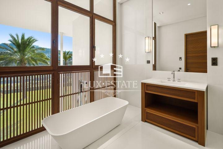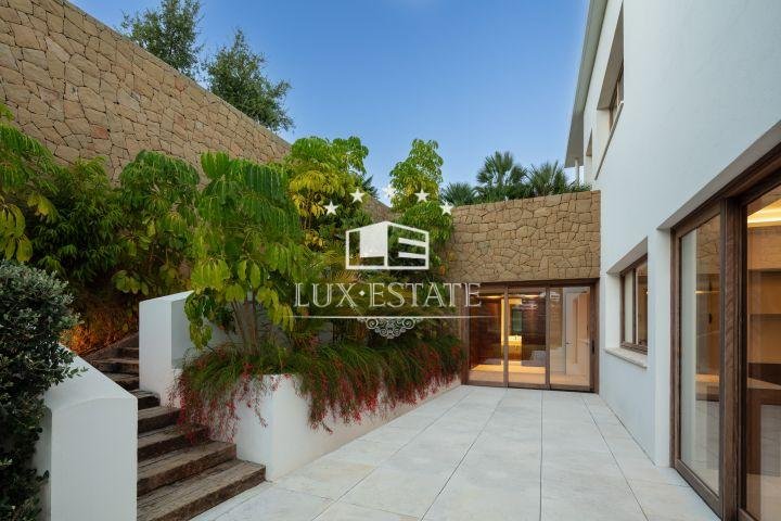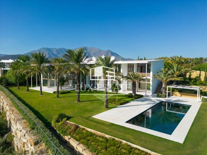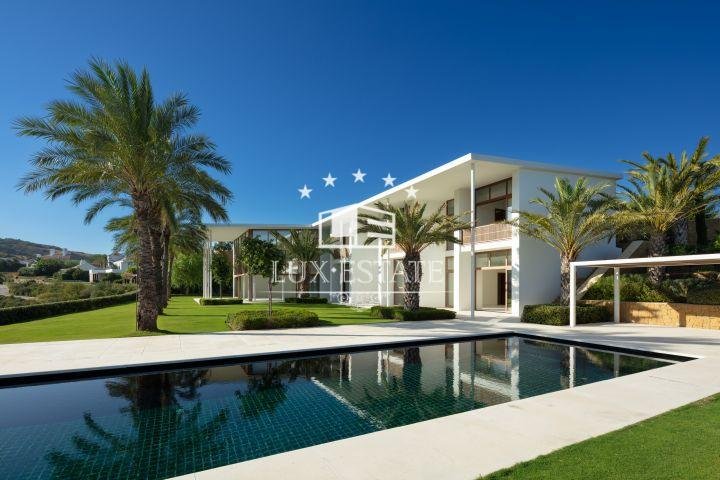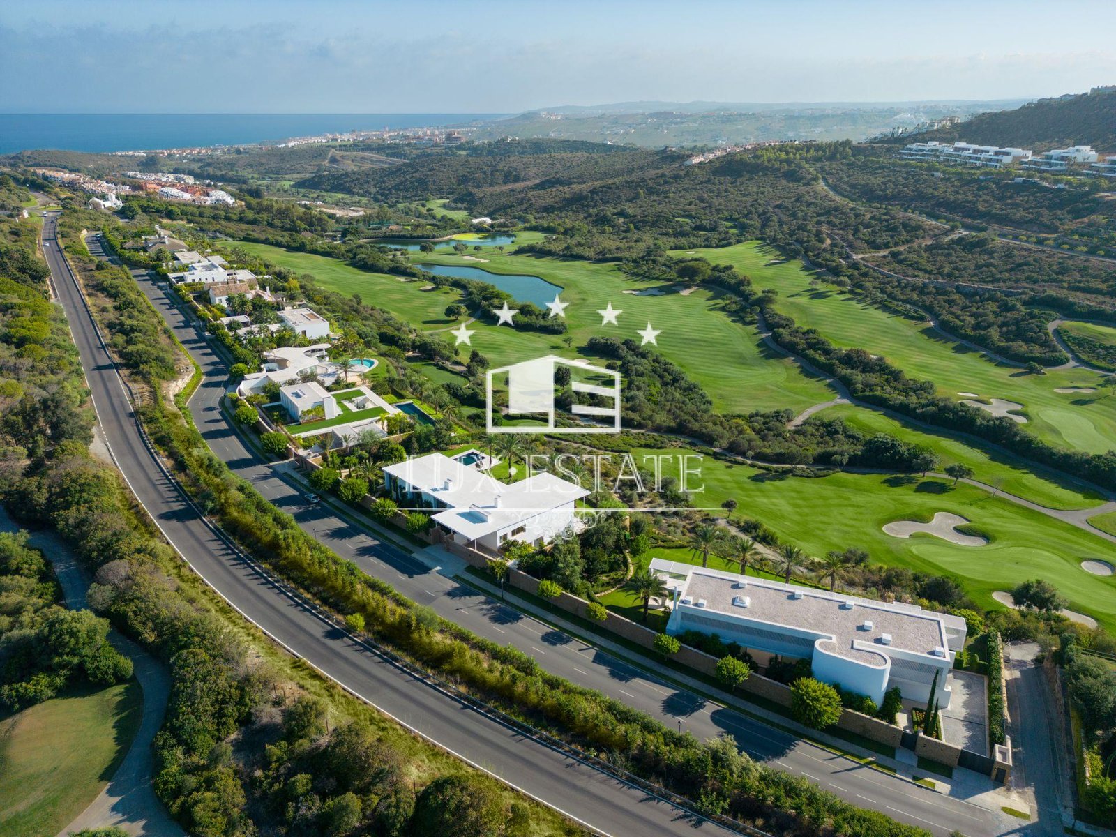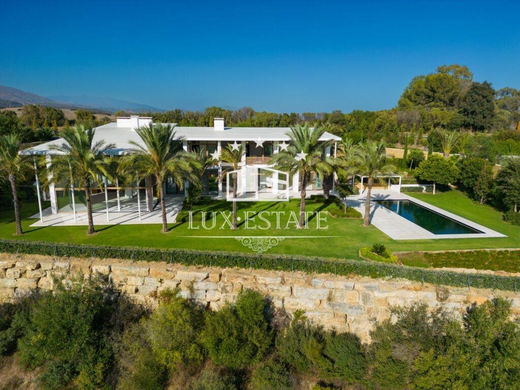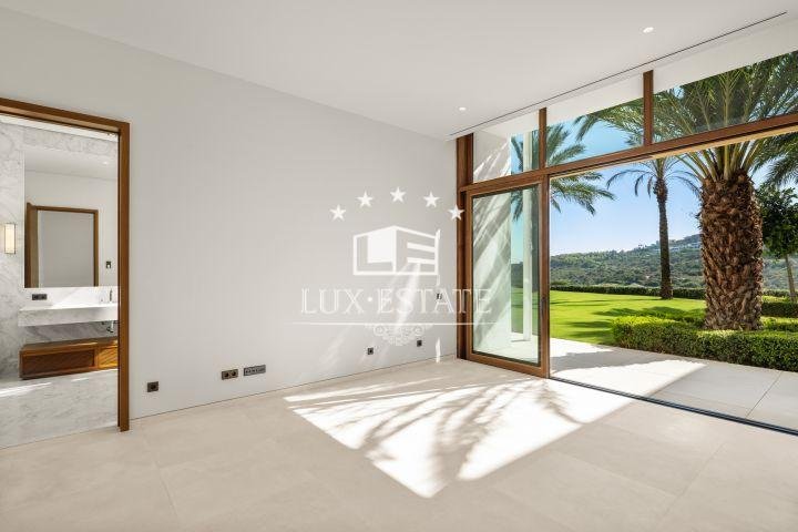This extraordinary dwelling, exclusive to the Finca Cortesin resort, emanates a captivating fusion of opulence and refinement. It surpasses all others on the Costa del Sol, owing to its magnificent plot and awe-inspiring vistas. The residence boasts numerous floor-to-ceiling windows on both levels, permitting an abundance of natural light to flood the interiors. The ivory exterior embellished with wooden details establishes a harmonious connection between the outdoor and indoor areas. Of particular importance are the impressive ceiling heights, which reach 9 metres in the living area on the ground floor. A distinguishing feature is the small living area on the top floor that looks out over the living areas on the ground floor – a secluded area that evokes a hidden terrace in a house. The upper level is reserved for the master bedroom and two guest rooms, each offering breathtaking views of the golf course and the Mediterranean Sea. The lower level accommodates the bedrooms, living area, and kitchen, harmoniously blending functionality with style. The entire ground floor allows for seamless access to the garden, inviting in fresh air and natural light. The residence’s prized possession is the meticulously maintained and expansive garden, which caters to outdoor enthusiasts and features a dark azure tiled pool that tempts visitors to take a dip. A built-in pergola at poolside provides the perfect setting for relaxation. The garden is adorned with impressive palm trees that complement the vistas of the golf course and Mediterranean coastline. The charming landscaping, featuring brilliant flower beds and neatly pruned shrubs, further adds to the innate beauty of the residence. Situated in an enviable location on the frontline golf course, boasting delightful architecture and an unparalleled atmosphere, this genuinely distinctive property bears testimony to the irresistible allure of Finca Cortesin.
